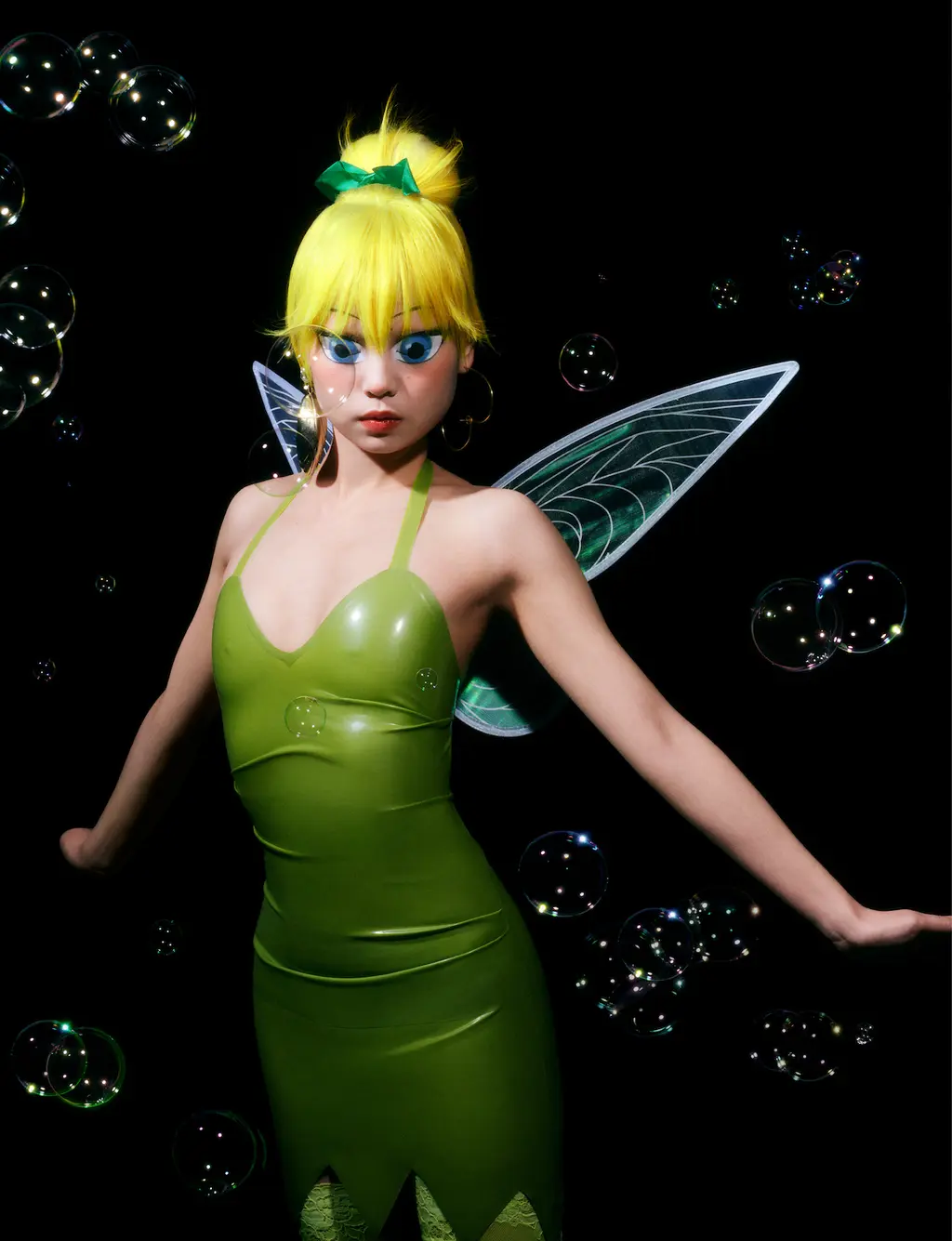 ewel wears custom dress MONIQUE FEI, earrings D’HEYGERE and AREA, stockings VERSACE, wings stylist’s own, Blush de Beauté in 02 Tender Apricot and Rouge à Lèvres Mat Lipstick in Janet Rust GUCCI BEAUTY
