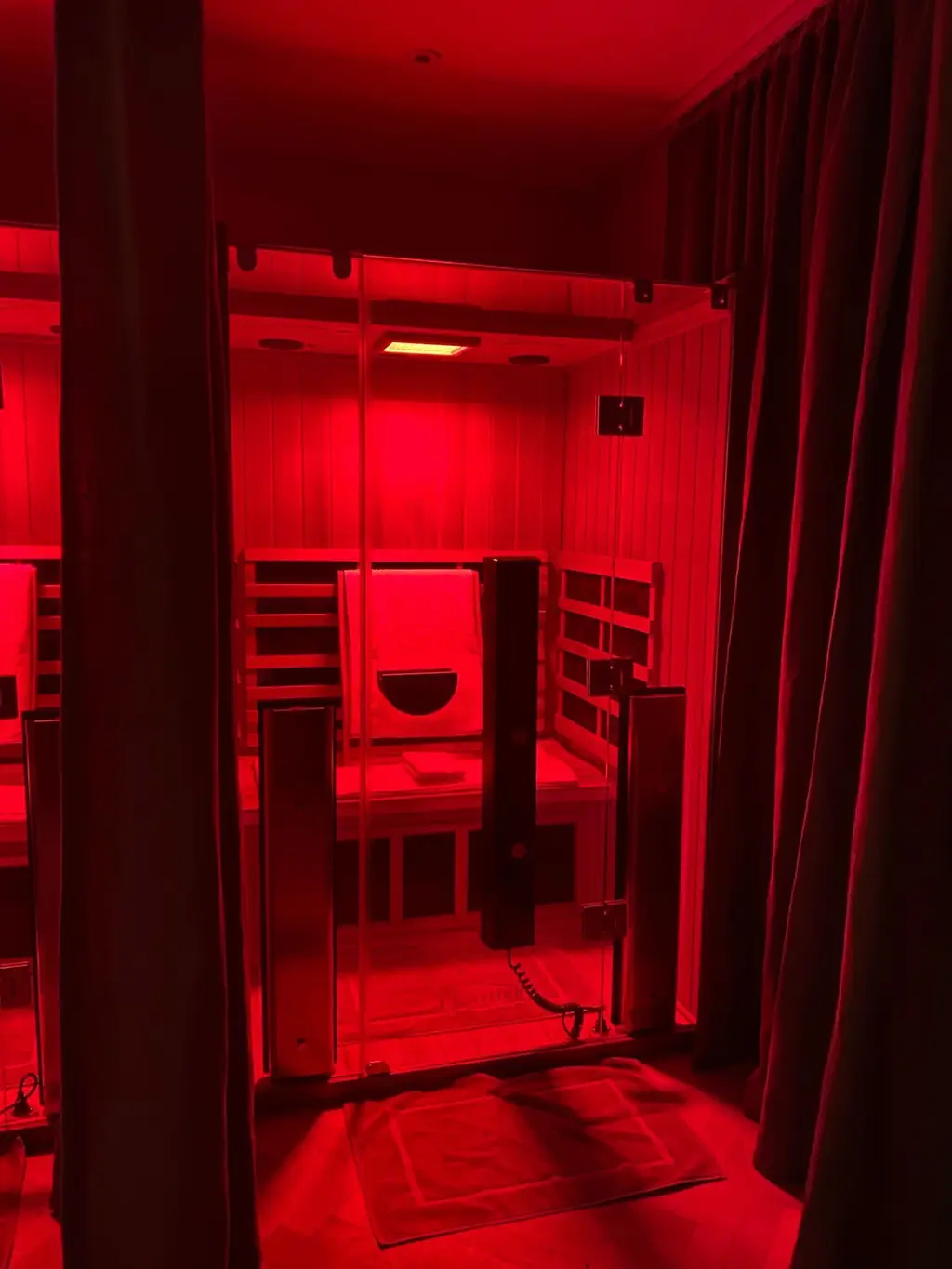 There are two small cabin-style infrared saunas at 180 Health Club. I am told to grab a glass of water, undress (completely, if I want to) and zone out for the next 25 minutes. I am shown how to change the colour of my sauna using a panel above my head and I’m shown how to dial-up a set of panels directly opposite my face for a “boost”. I flick between green, yellow and blue before settling on red for the last ten minutes. Chromotherapy is cooked into this sauna experience. Otherwise known as colour light therapy, chromotherapy is the belief that exposing yourself to different coloured lights will have a varying impact on your bodily senses and responses. Green and yellow are supposed to reduce skin redness and inflammation, and red is supposed to promote cell renewal and relaxation.