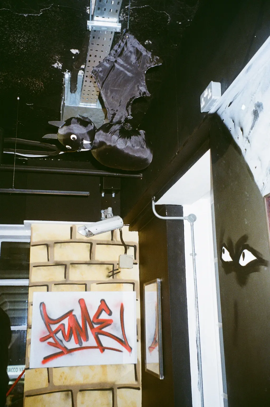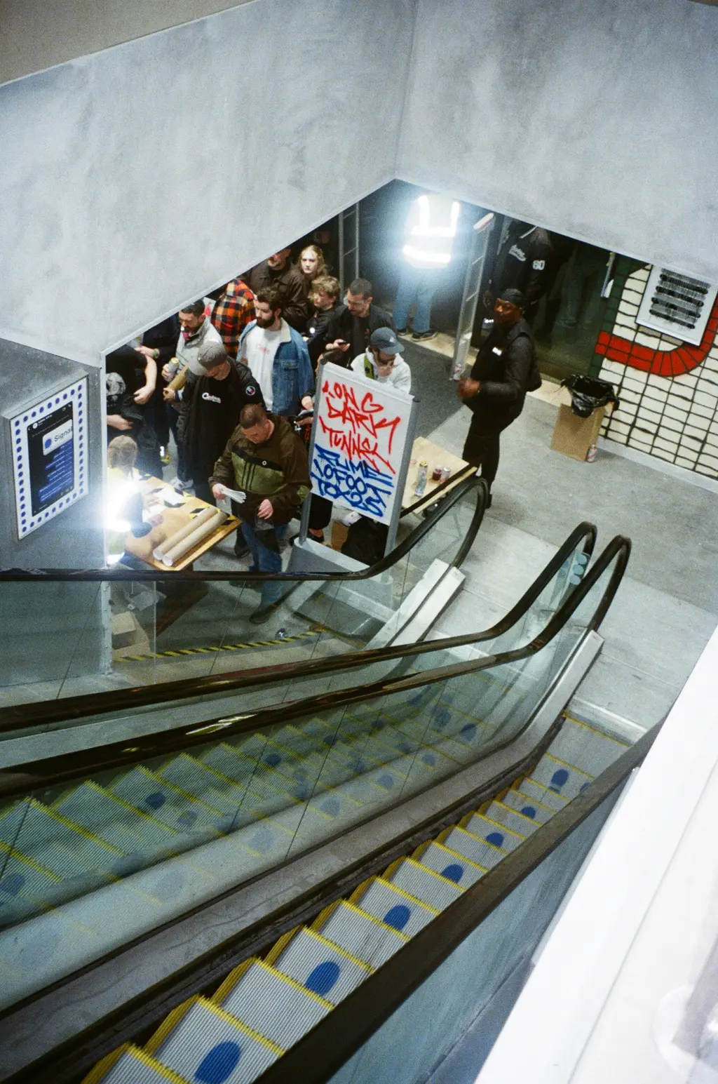 Old pals, the trio have joined forces on an exhibition held footsteps away from Piccadilly Circus station’s third exit. (Directions were shared via email mere hours before opening.) Entitled Long Dark Tunnel in ode to London’s underground system and Origin Unknown’s 1997 jungle classic, Valley of the Shadows, the show is set across Arts Arkade’s two floors, complete with an escalator and a set design redolent of the grubby train tracks the three have long stalked.