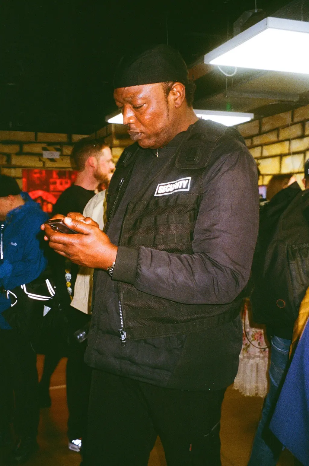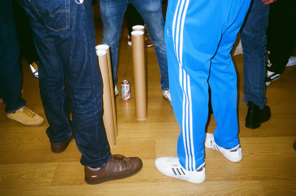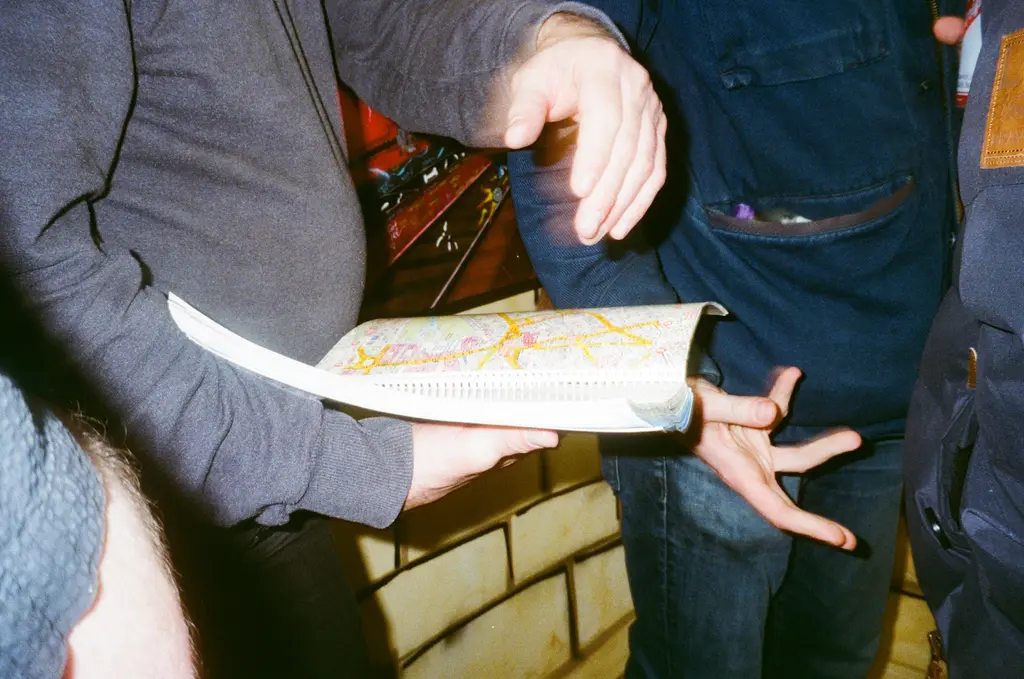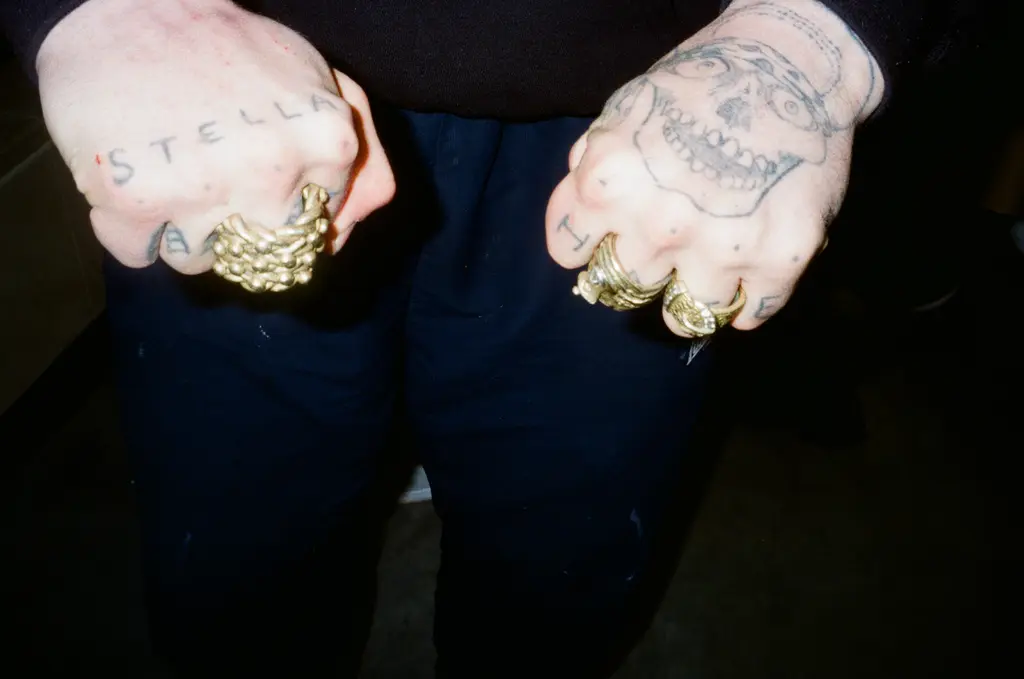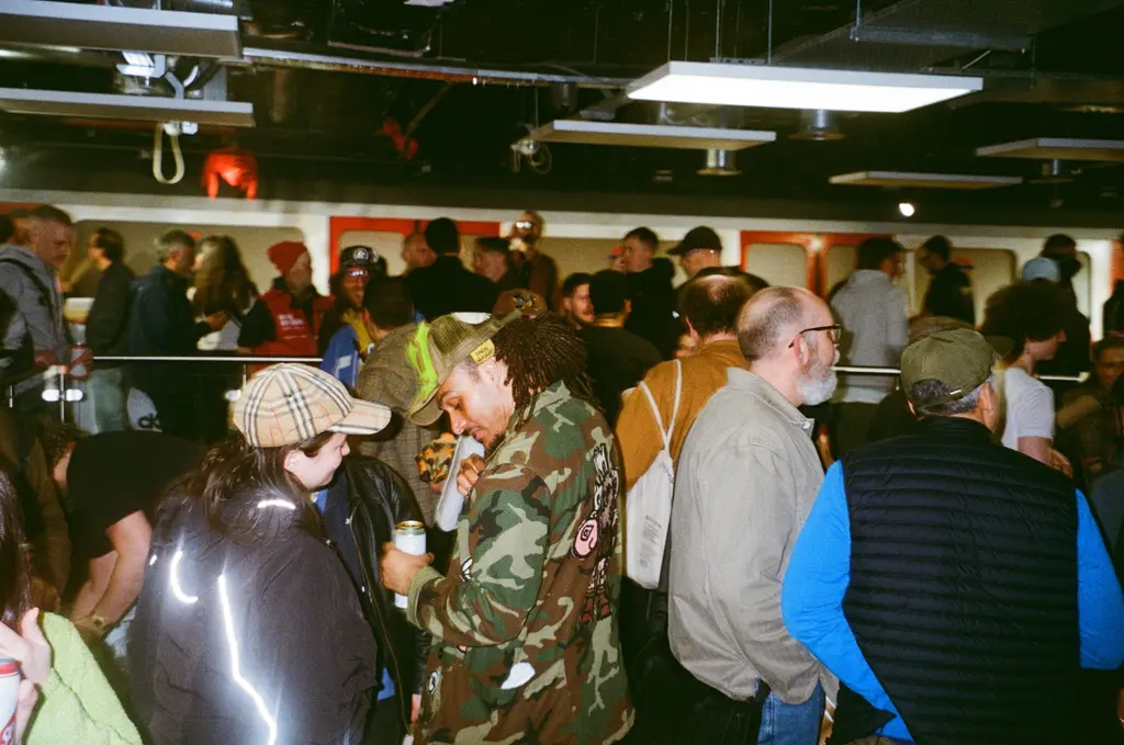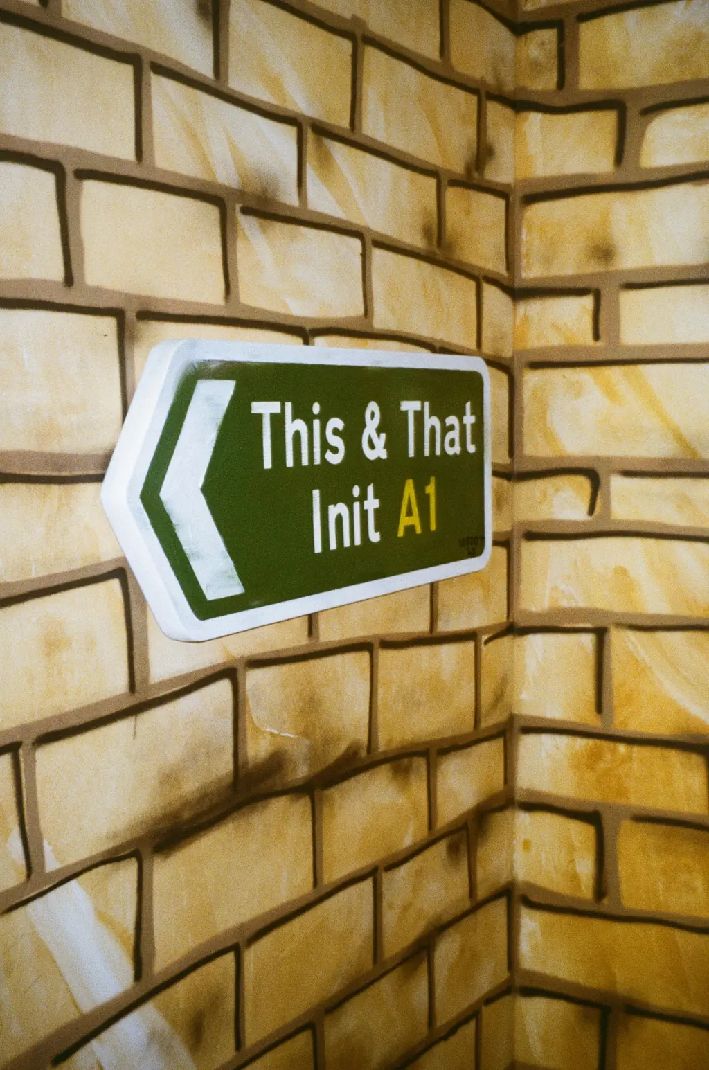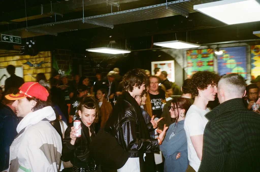 Inside, everyone from director Jonathan Glazer, Palace and Trapstar founders Lev Tanju and Mikey Trapstar, DJs Benji B and Skream, to musicians Mica Levi and Jimothy Lacoste and renegade designer Noki can be seen enjoying sangria (or “Track Grease” as it’s marketed). The walls are lined with 10Foot’s motorway signage paintings, each one providing yet more confusing directions. Turn left for this “This & That Init” signals one sign, while another flags an upcoming railway station with the directive, “Come We Do It Then.”