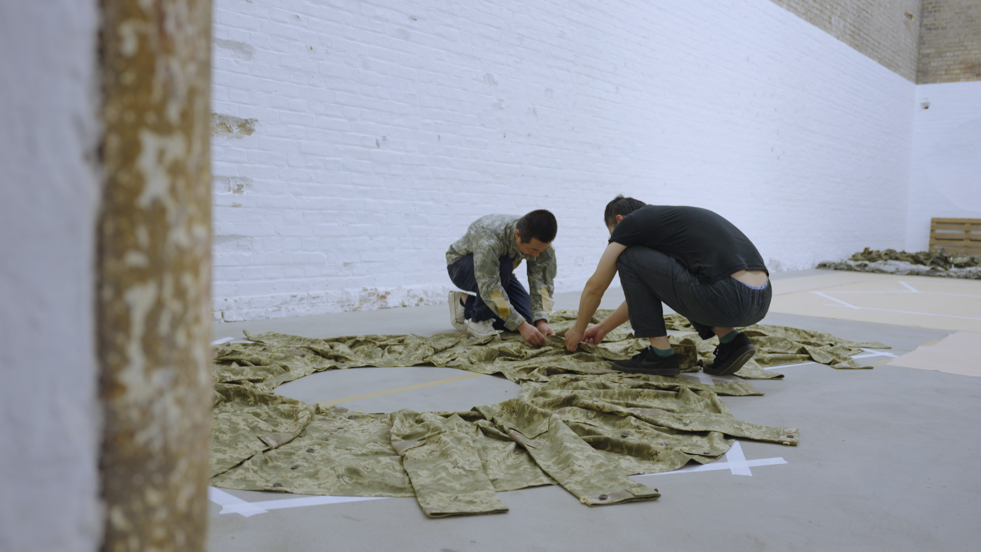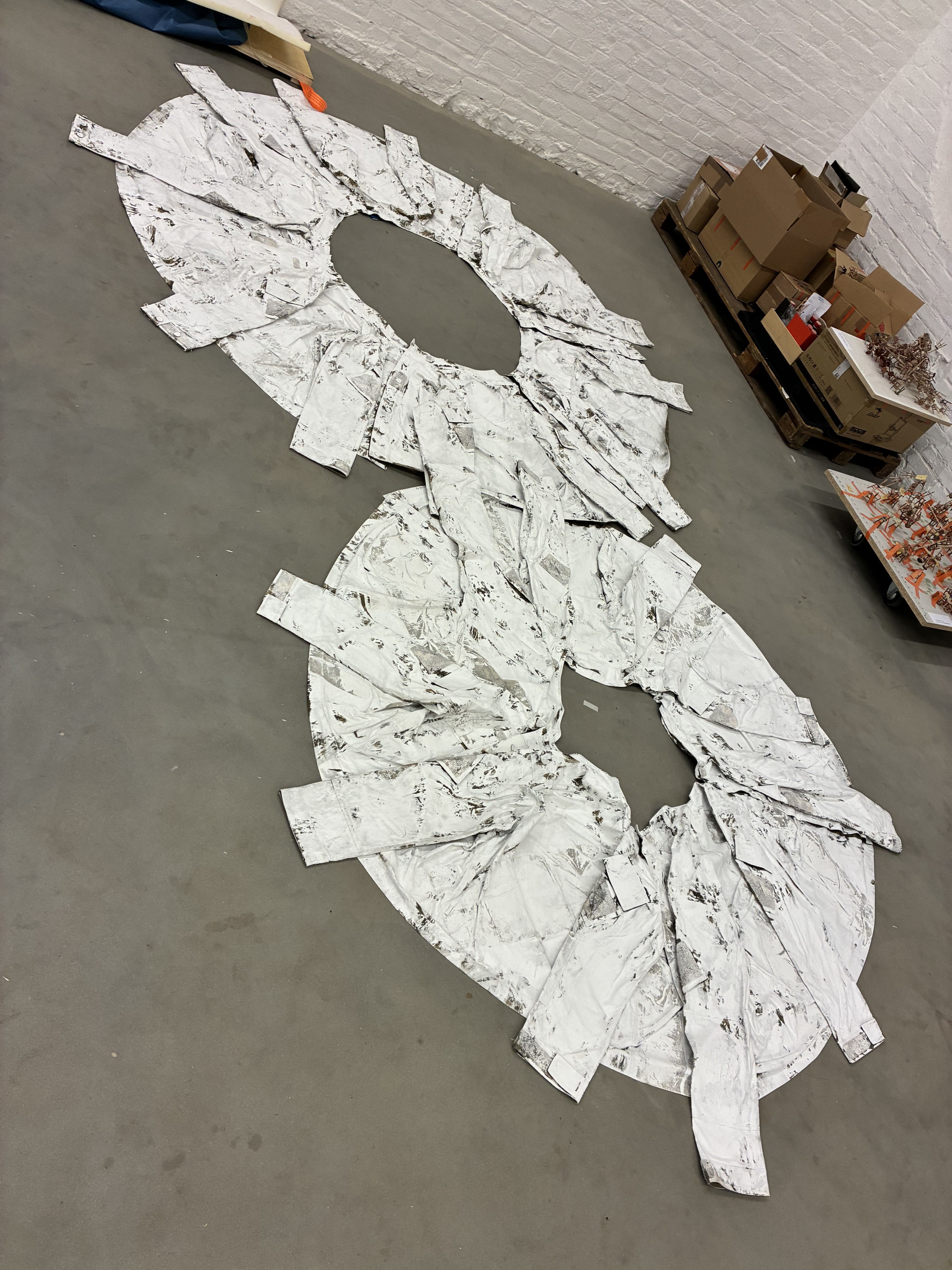 Lastly, each sphere is covered in a wash of thick white paint. Covering the material wasn’t always the plan, but he idea came after a Ukrainian architect pointed out that some of the soldiers’ relatives might find the camouflage motif insensitive – perhaps they wouldn’t want to see cut up uniforms in a gallery, even if they were covered with cats.