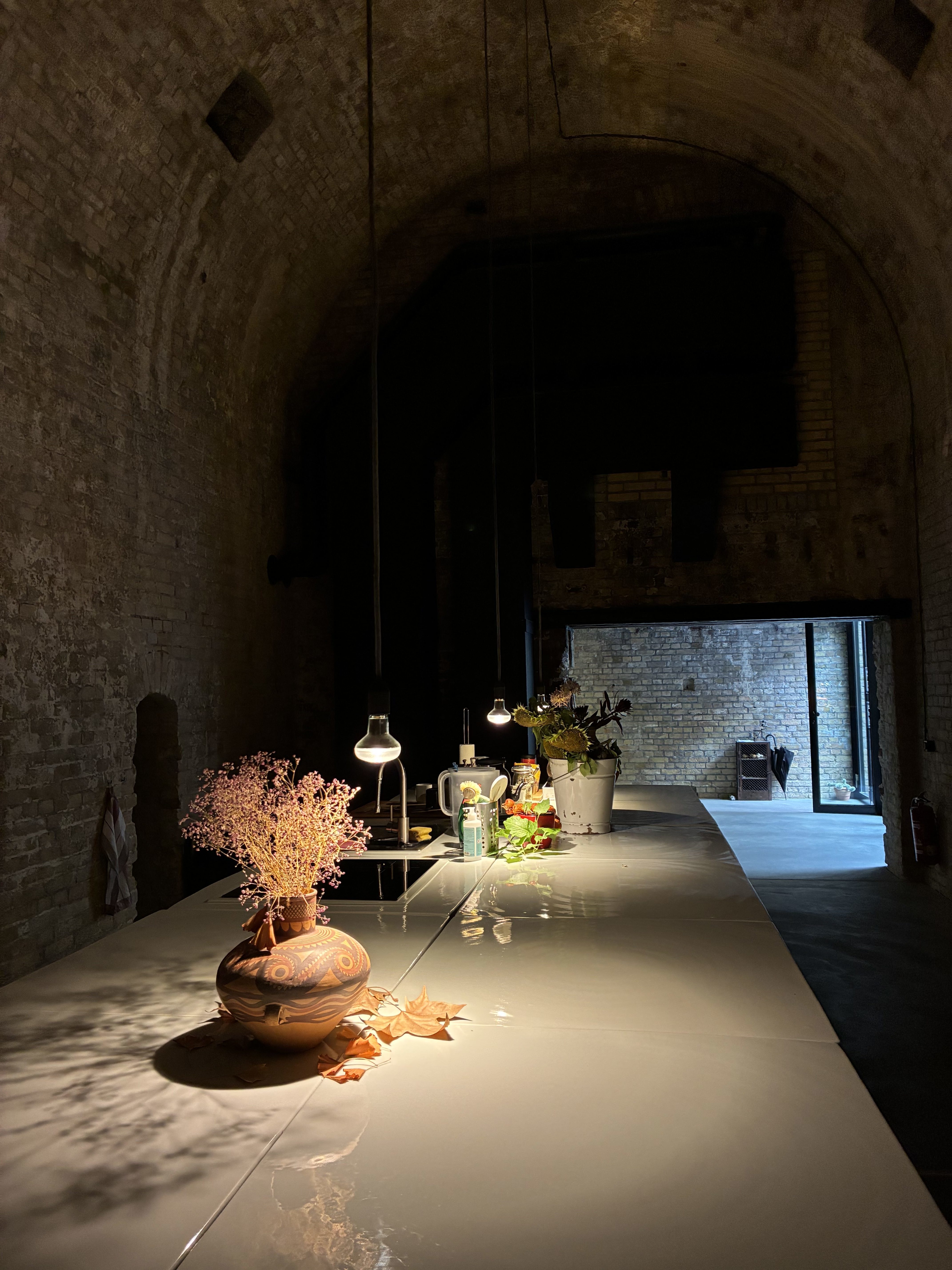 We’re sitting in a 30,000-square-foot underground studio in the German capital, which Weiwei renovated from a former brewery after leaving China in 2015. Airy and sunny, it’s covered by a towering, cathedral-esque ceiling with huge windows, flooding the space with light. Rooms are segmented by open doorways, and at its centre sits a shadowed communal kitchen shared by the hushed, polite team that work in the 68-year-old artist’s HQ.