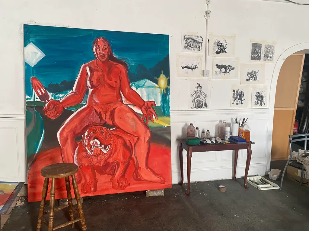 Her favourite piece is Dinner-time, an 8x10ft mural-sized piece that depicts a peculiar sit-down situation. Four people are sitting around a table, one of them gnawing away at a piece of chopped watermelon, another absent-mindedly drooling and fingering a cup. A dog angrily sniffs his ball between this scene and what’s happening in the next room, where a naked woman is laying with a hand on her crotch. Above her, a crimson red moon shines through a window, lighting up her thighs and torso.
