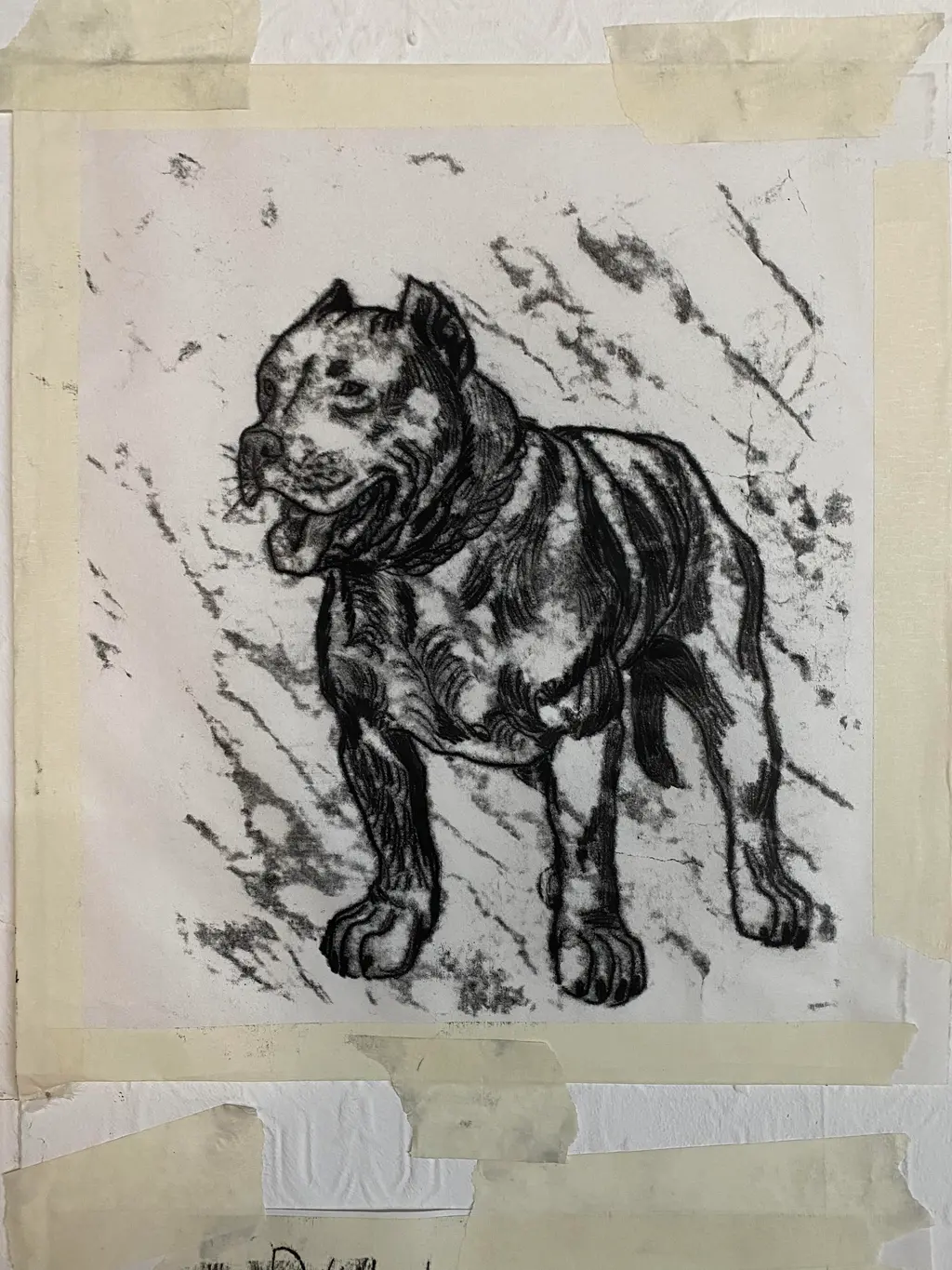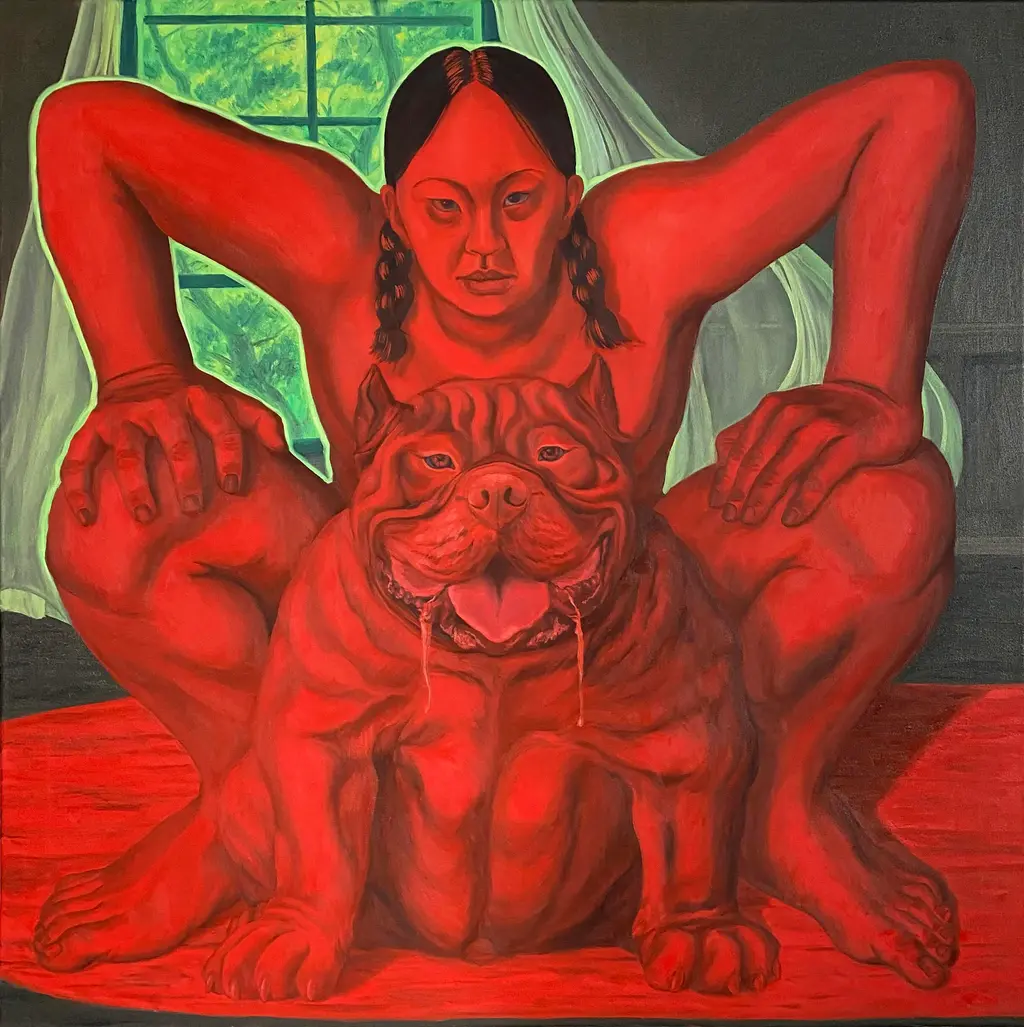 Take the primal, emotionally-charged 狗女人放狗屁/Dog Woman Releasing Dog Fart /The Bitch is Non-sense, for example, an oil painting of a naked woman crouched over the top of a pitbull dog. The two figures intertwine in hues of black and blood red against a popping, neon green background, the dog wagging its tail furiously.