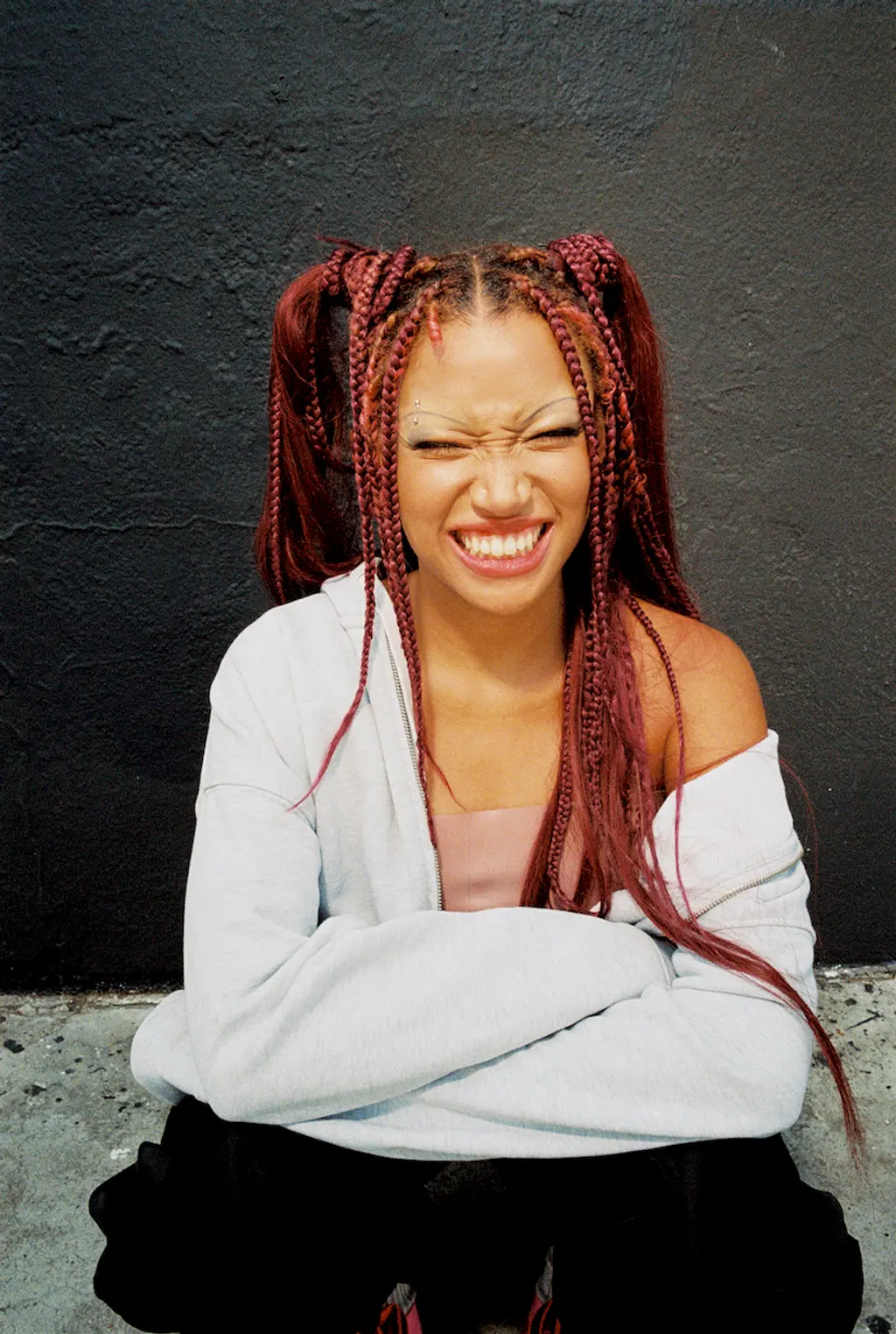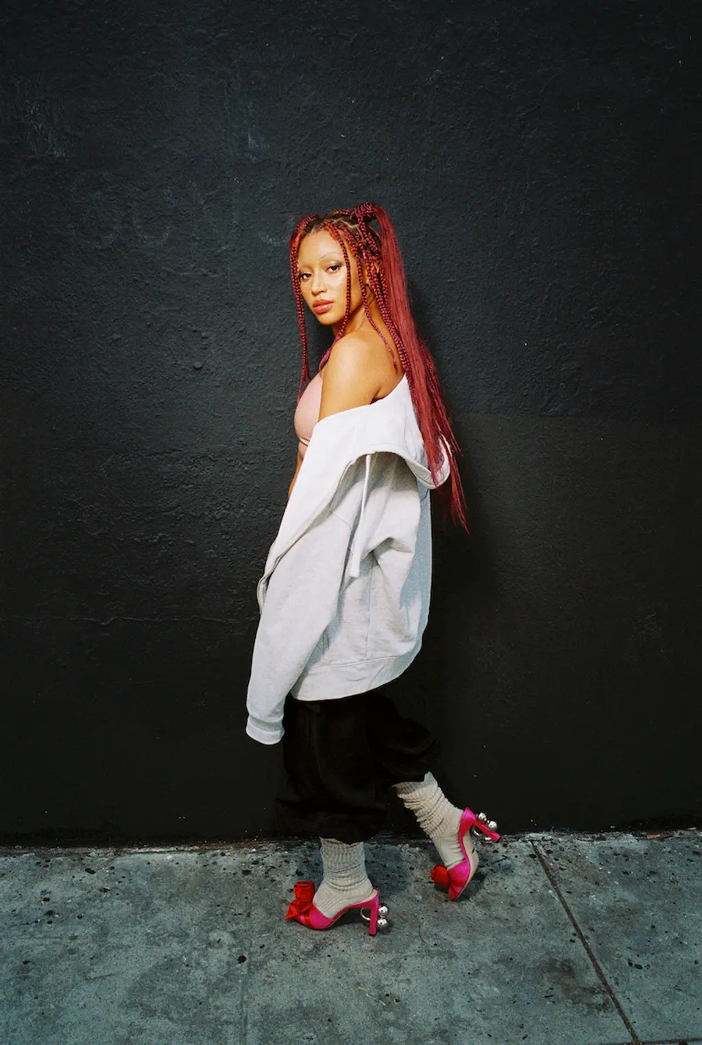 Amandla wears top and shoes GUCCI, hoodie LOS ANGELES APPAREL, trousers SUPRIYA LELE and socks stylist’s own