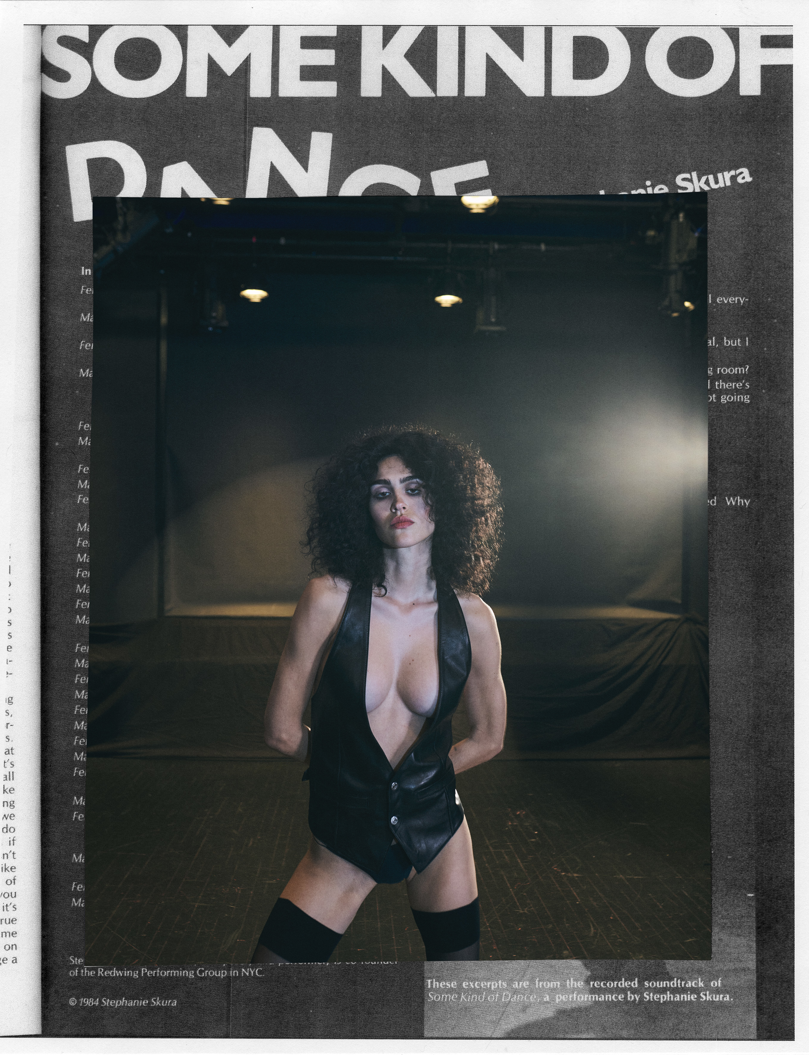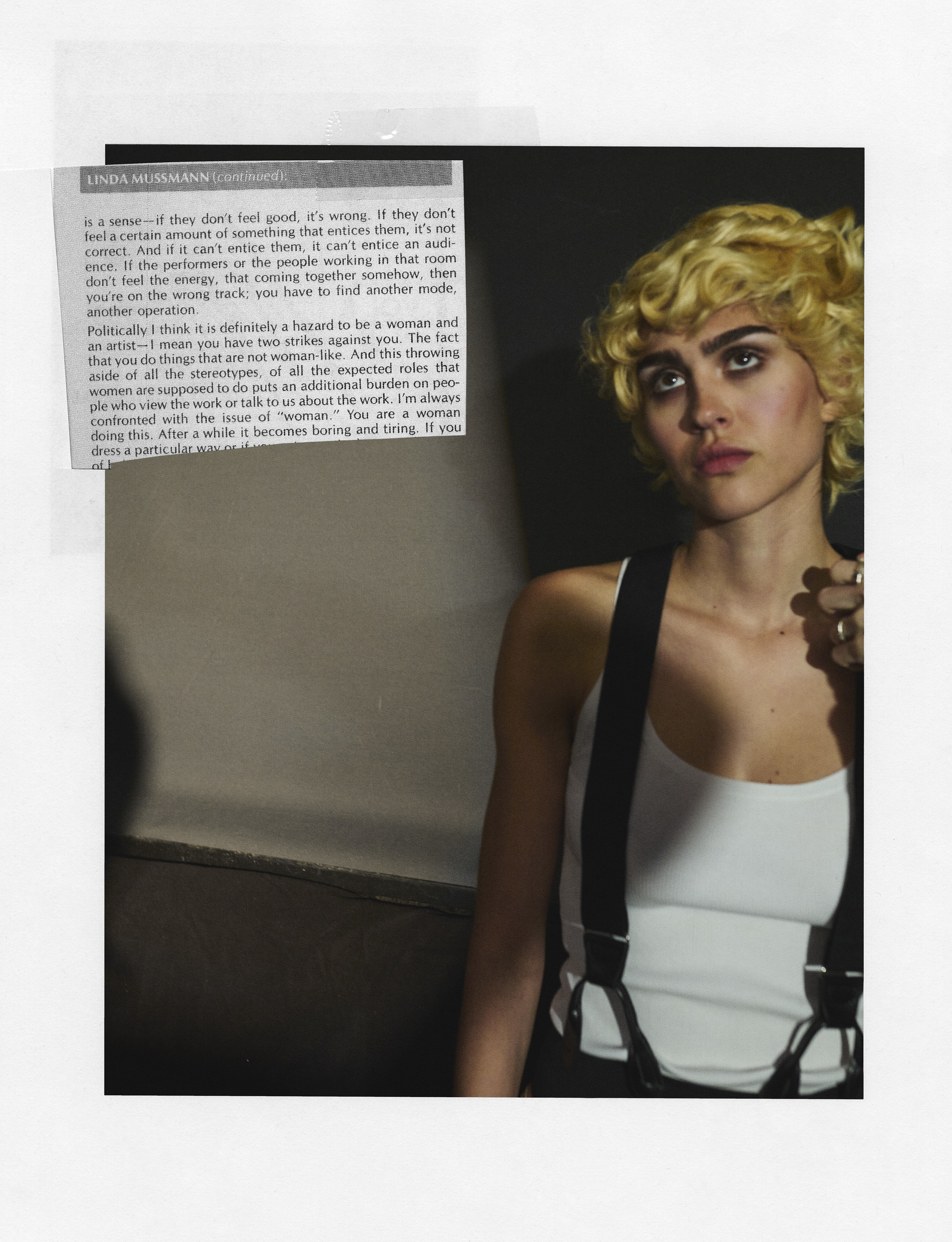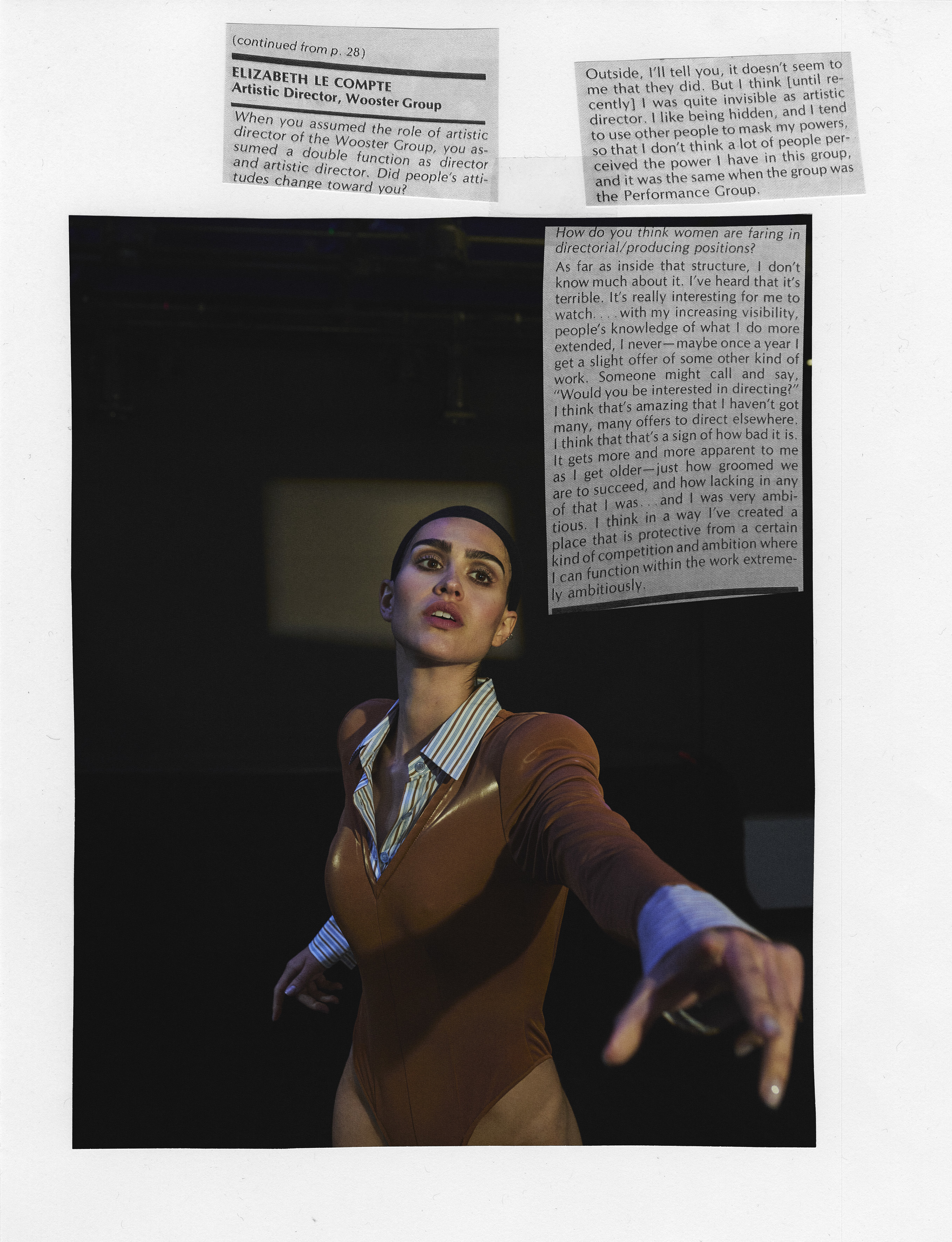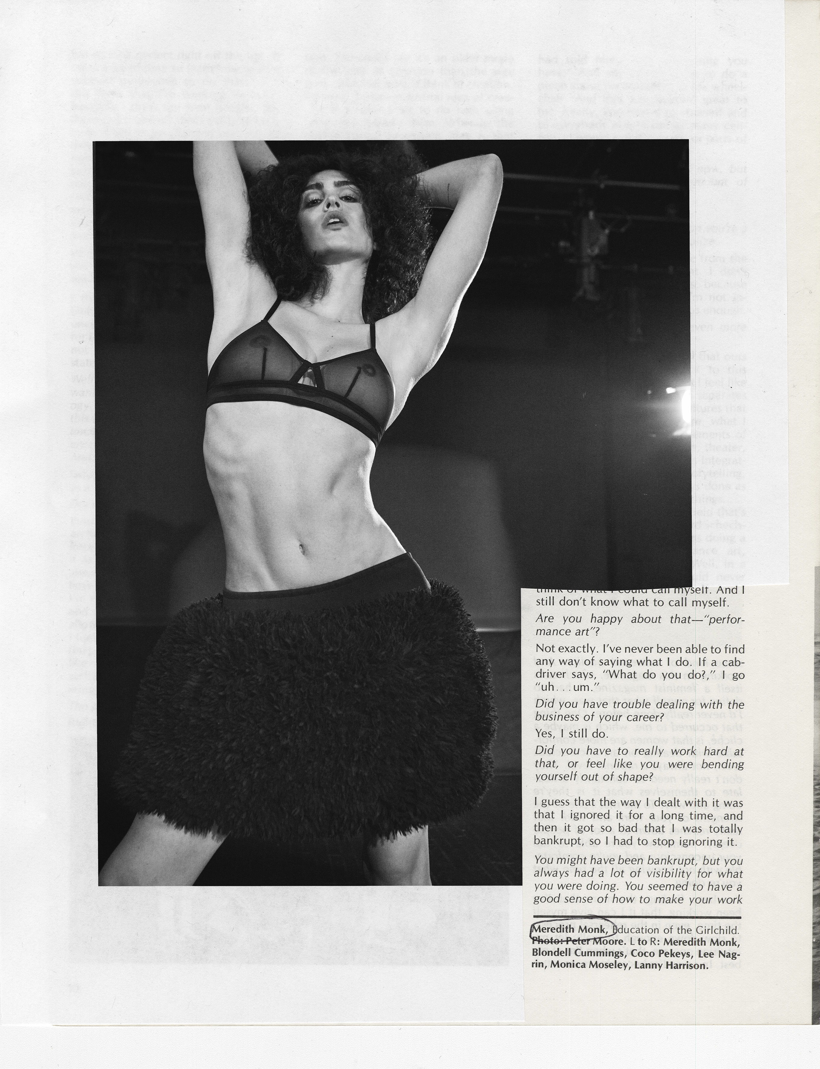 In 2021, walking down the street in Soho I found a 1984 copy of the feminist magazine Heresies. It was in a box of books belonging to the artist Mary Beth Edelson who had recently died. The issue– focused entirely on women directing, writing and performing– struck me as a time capsule of protest and demonstration. Many of the artists I hadn’t heard of. Some, like Meredith Monk, are legends. I collaged these pages into Amelia’s story as so many of the words seemed applicable to her position; of being a body in a world of images rarely accompanied by words. Amelia and I made these performances together. It is her work and mine.