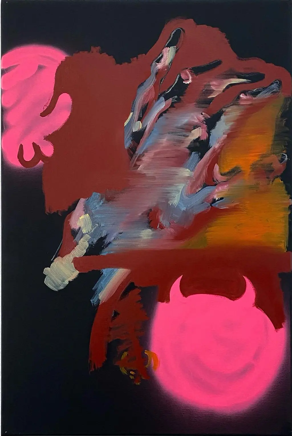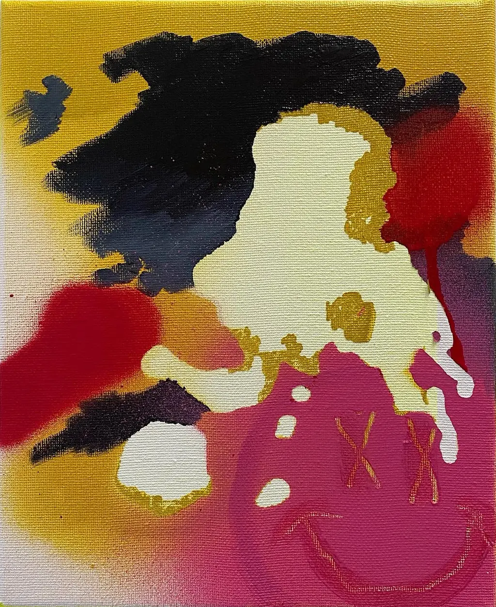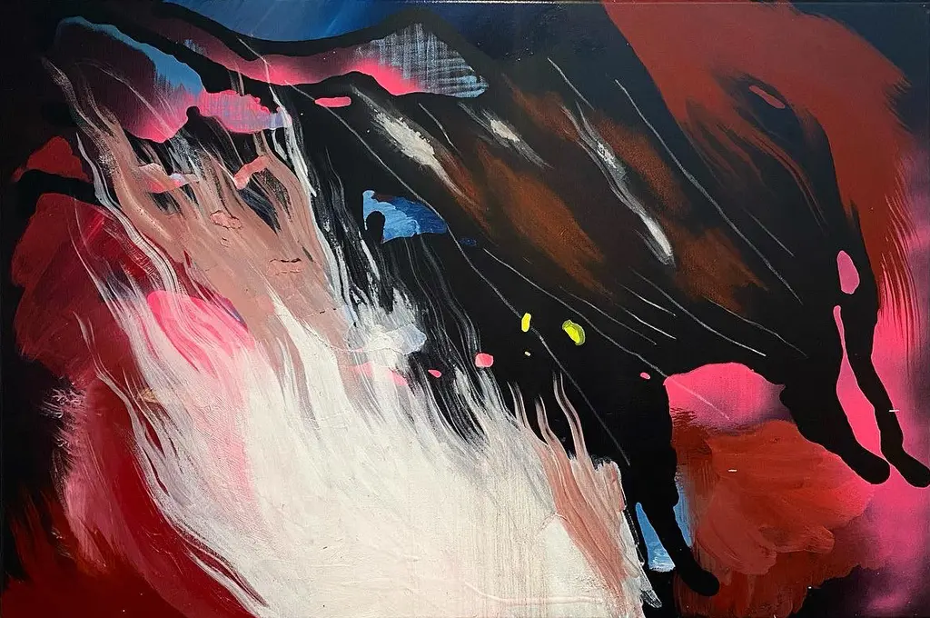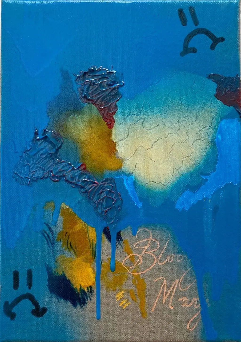 Amymay George creates work rooted in her state of mind. At times distressing and difficult, but always deeply personal. The Hastings-based artist conjures abstract scenescapes, painting thick layers of acrylic on canvas, twinned with splashings of spray paint. There’s a child-like innocence to her approach, contrasting vibrant colours and characters, each piece representing fragments of past memory and present emotion.