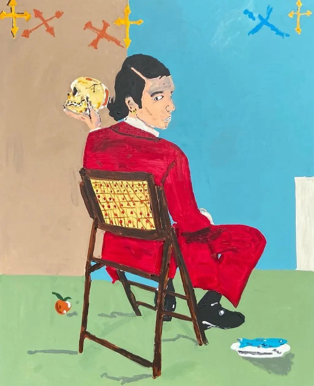Both have been working as artists for close to a decade now. Murgatroyd’s acrylic paintings capture personal snapshots of his life, like a recent portrait of his then-pregnant girlfriend, or the boys he grew up with in his Bradford hometown kitted out in Lacoste polo tops, gold chains and Nike TNs. Another common theme is his obsession with history – contemporary scenes are often littered with historical references like architectural pillars, antiques and distinctly British patterns.