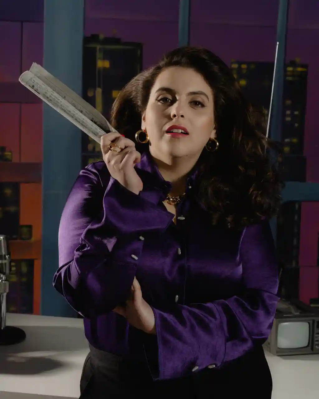 Once Johanna moves to London, she lands a job at a weekly rock magazine. She adopts a pen name, Dolly Wilde, solidifying her transformation by ditching the ill-fitting, unflattering hand-me-downs for fishnets and eyeliner – tighter, lower, rock’n’rollier. The real challenge for Feldstein, however, was not in the sex stuff, nor in the revealing costumes (though she does admit they were “so outside my comfort zone”), but in pinning down the perfect Wolverhampton accent. “I knew that I could do it, which makes no sense, because I had never heard a Wolverhampton accent before,” she says. “I couldn’t have told you even where on a map of the UK it was, but I just knew her. I just knew her. This message of telling everyone, but specifically young women, that it’s OK to try on different versions of yourself, rip one off, and start again – and that that is human, and important – was just so meaningful to me.”