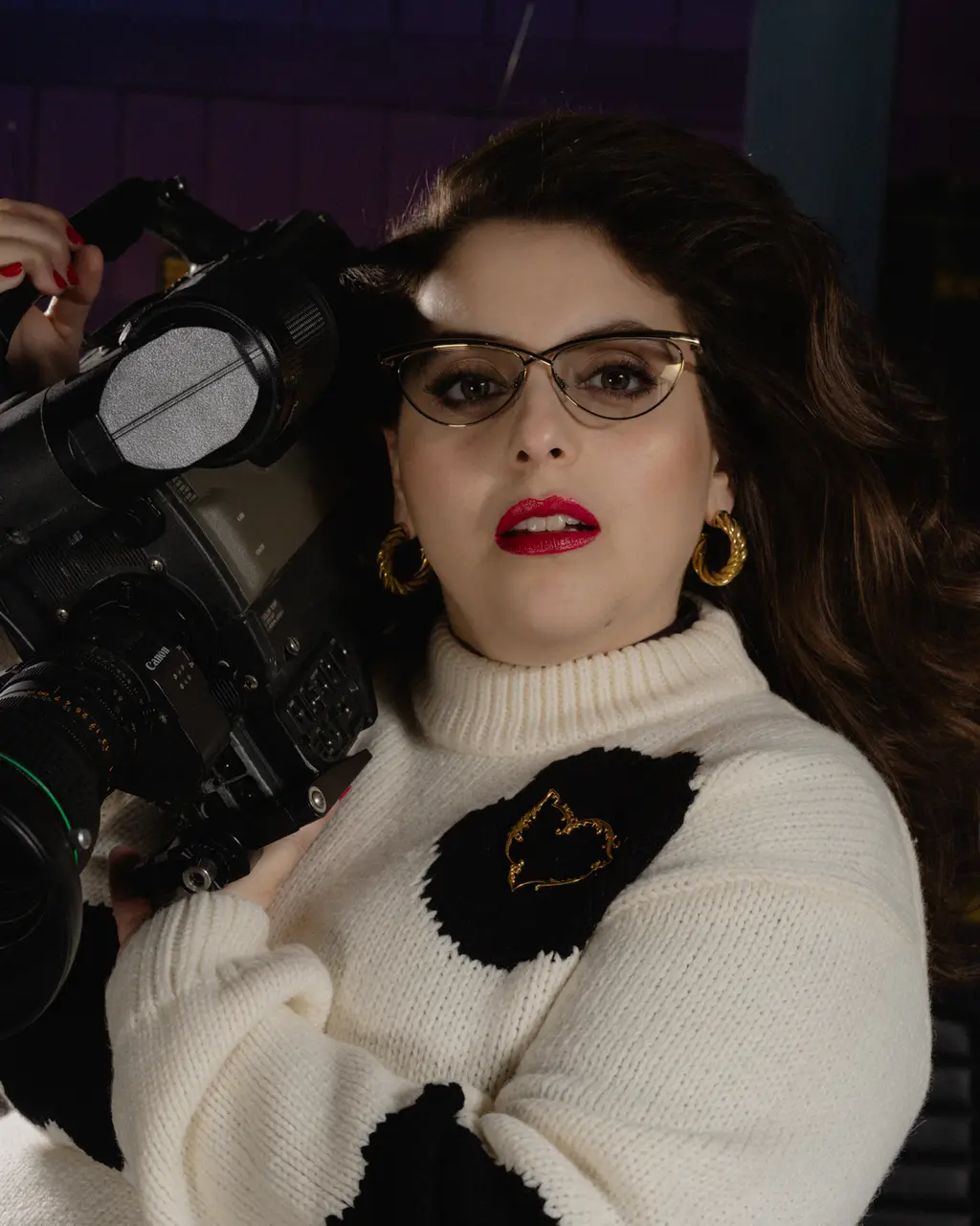 Sweater Tibi, glasses Le Specs, earrings Lombardi, brooch Queenie Cao, ring Lady Grey.