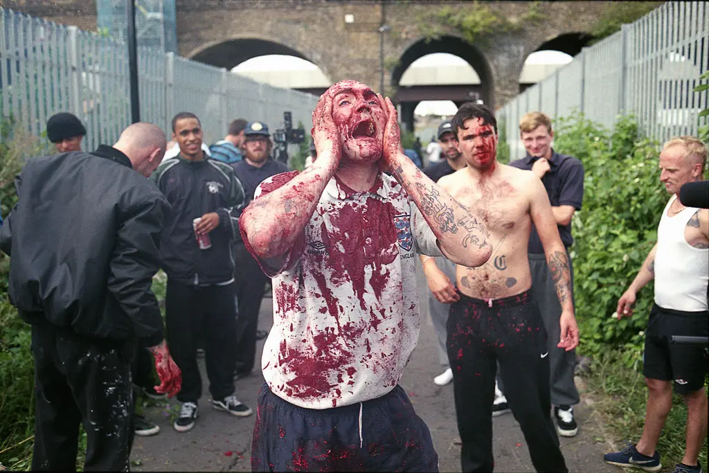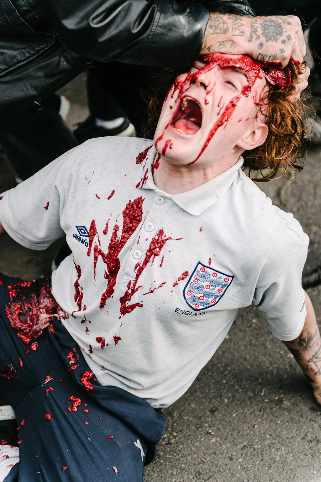 Like a knock-off of the ’ooligan classic Football Factory, the Blokes meet the other blokes down a derelict path and, dressed in sports casuals, they fight. Not a scrap, but a fight. At one point, man-in-wig from earlier plucks out a poor sod’s eye straight from its socket. Then he eats it. Whole. A couple of headbutts, swings and bone crunches later, someone’s head is bleeding. Next, a squid is pulled out of a bloke’s stomach. Then, in comes the siren: