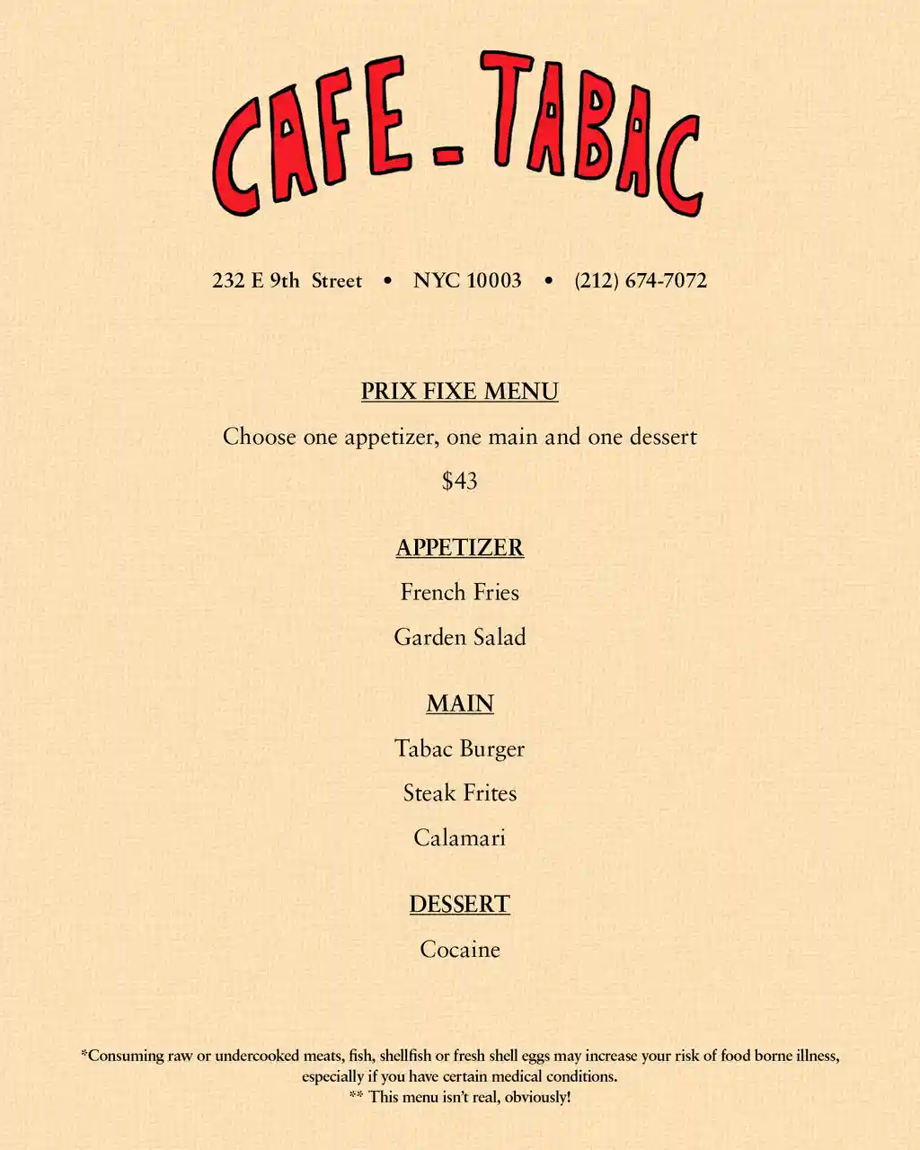 A reimagined menu based entirely on what patrons told us they remembered eating (and snorting) at Café Tabac.
