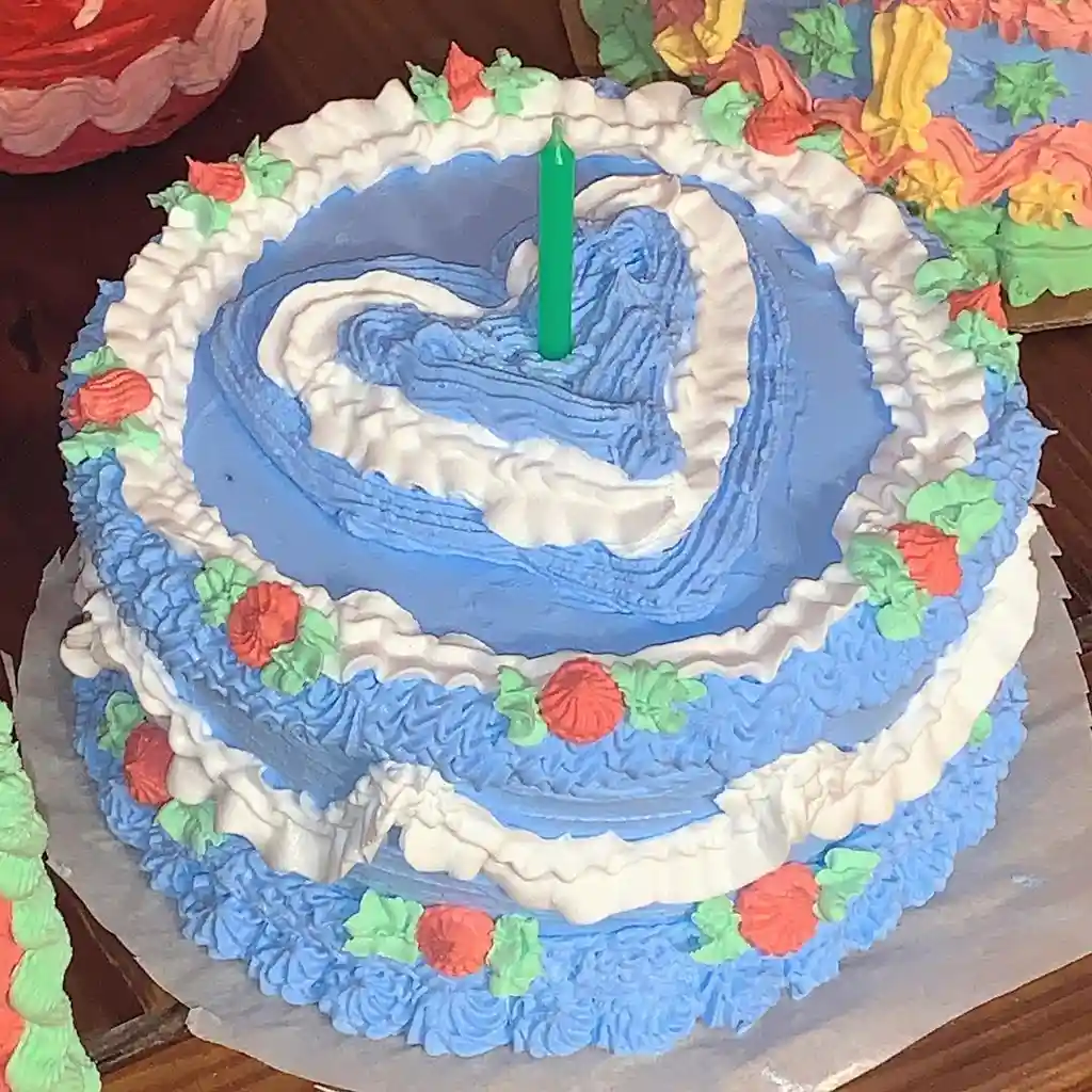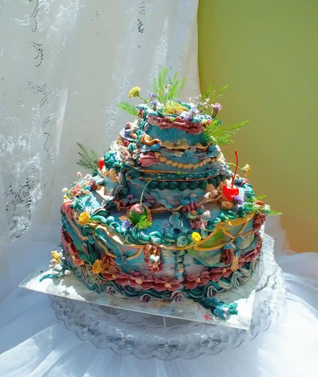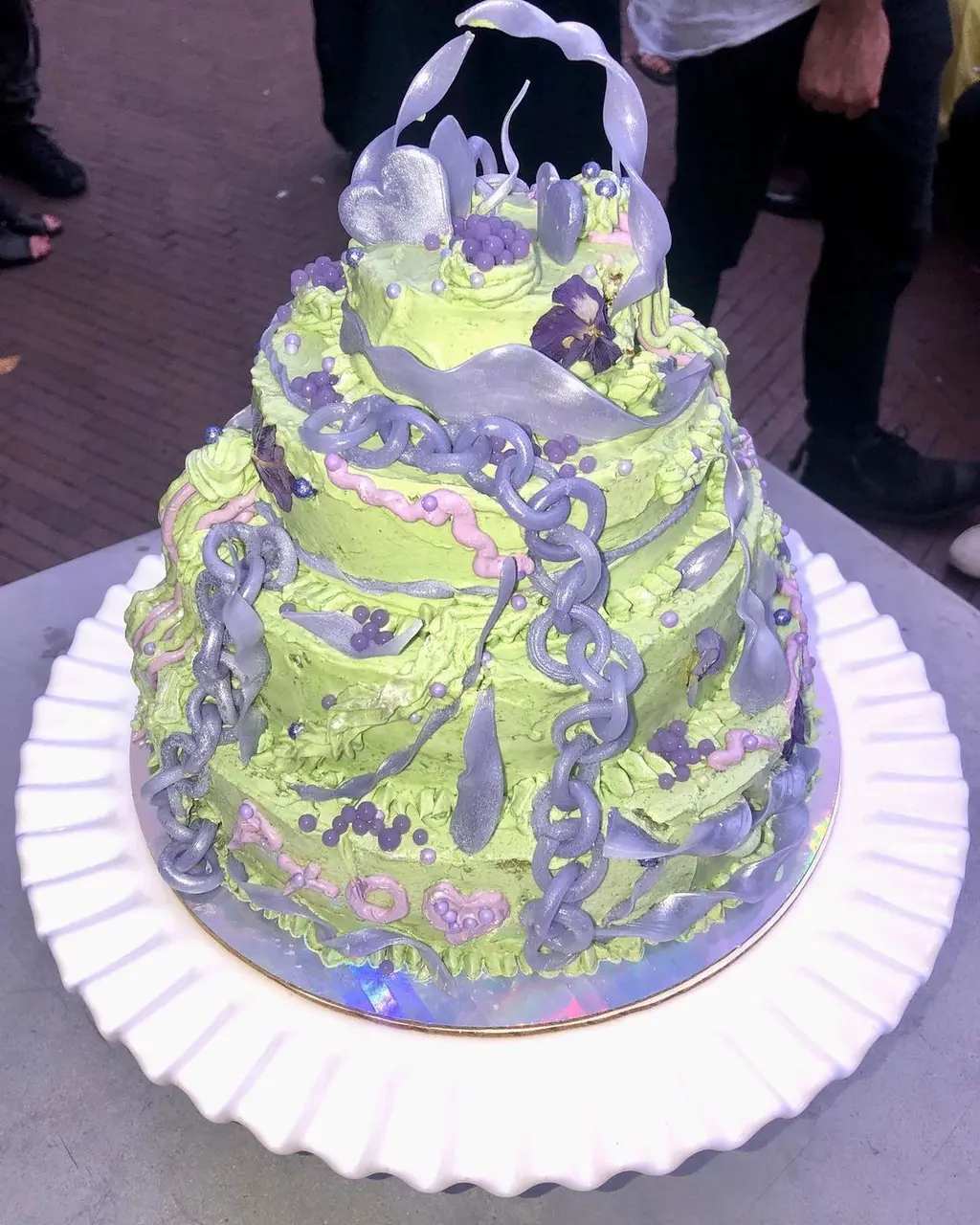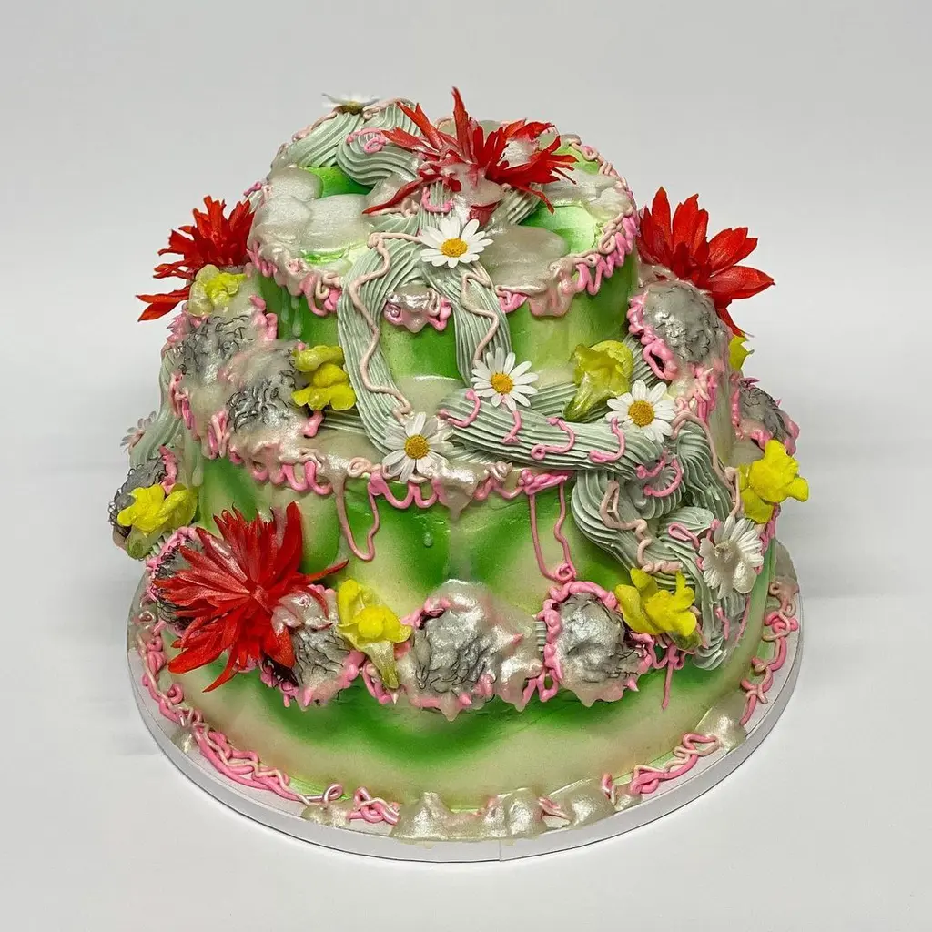“I think the fact that messy cakes are trending is reflective of people pushing against glossy airbrushed-ness,” he says. “These cakes spit in the face of the Is It Cake? trend.” McCallum hopes the rise in interest is more than just a passing craze and instead signals a wider counter-aesthetic. “For everyone who wants a fancy 50-tier wedding cake, I’m sure there’s someone else who feels more akin to a neon cake piped with an in-joke or an overshare.” You can commission Scarlett Gray, AKA Bratty Cakes, for one of those irony-frosted creations, one of the many bakers who are riffing on the Lily Vanilli Regency-era style of decoration itself.