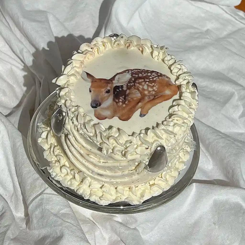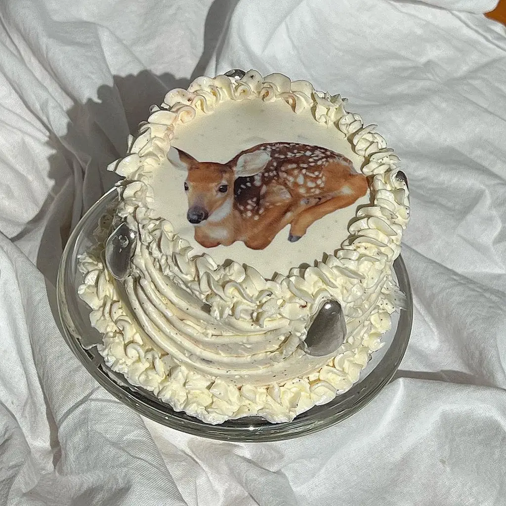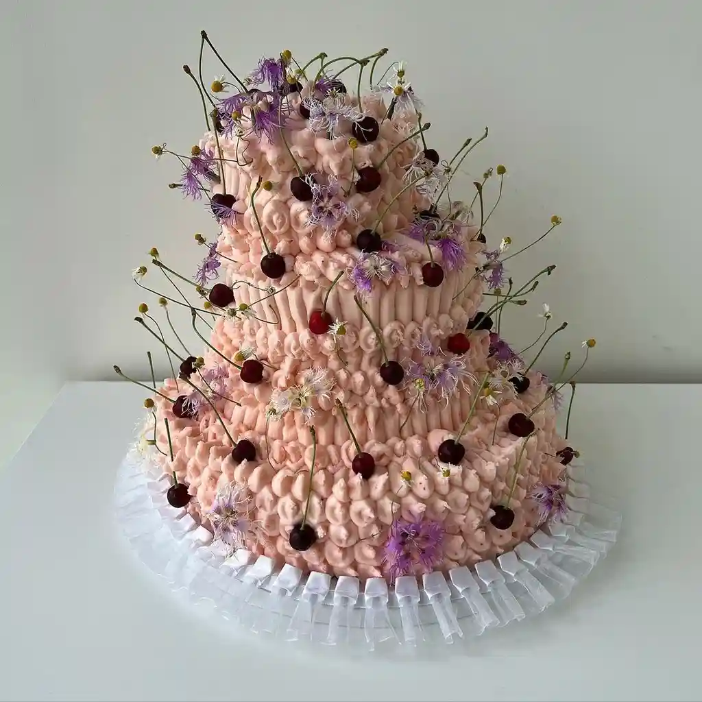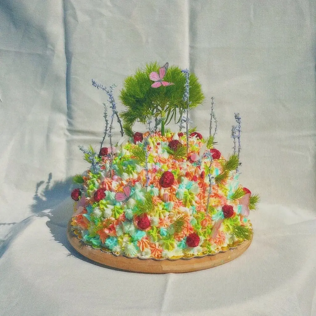 On one end, you have feral, sloppily-iced cakes with ironic “sorry I’m ugly :(” messages, appealing to the fashion crowd who wear Praying caps. Then you have foraged fairycore masterpieces that appeal to the current idealisation of the natural world as a reaction against climate change (think pastoral fantasies and cottagecore). Aimee France, a 23-year-old self-taught baker, who’s based in NYC and specialises in vegan baked goods, describes her creations as something that would be “found in the woods”. As she explains, “There was no real driving factor that made me start decorating cakes the way I do now. One day I just decided to make and decorate a cake, and that’s how it came about. But something that does inspire my cakes is nature and foraging.” France has been taking commissions full-time for over a year now, having started her business over two years ago.