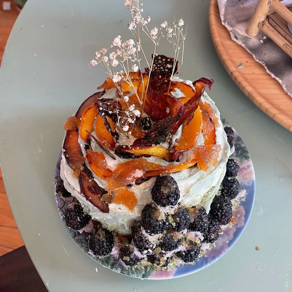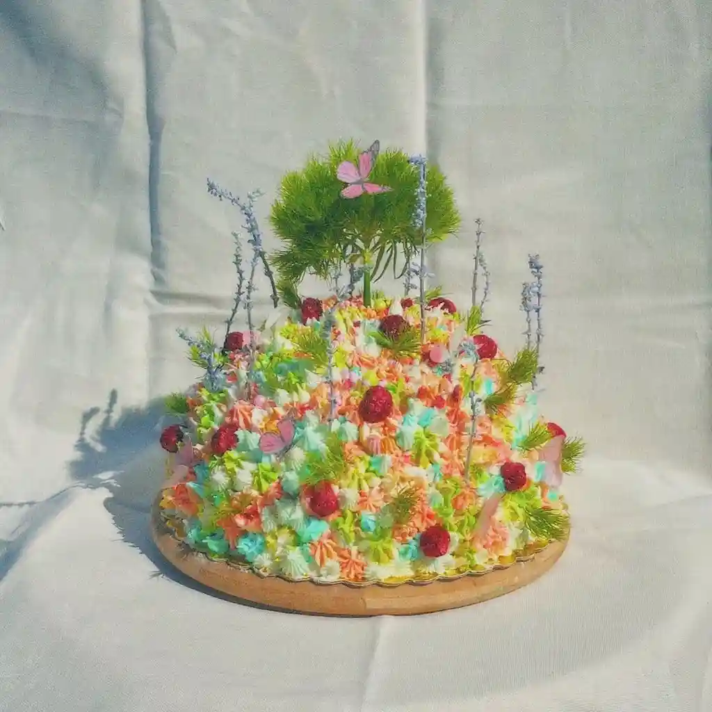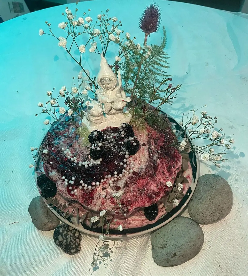 On one end, you have feral, sloppily-iced cakes with ironic “sorry I’m ugly :(” messages, appealing to the fashion crowd who wear Praying caps. Then you have foraged fairycore masterpieces that appeal to the current idealisation of the natural world as a reaction against climate change (think pastoral fantasies and cottagecore). Aimee France, a 23-year-old self-taught baker, who’s based in NYC and specialises in vegan baked goods, describes her creations as something that would be “found in the woods”. As she explains, “There was no real driving factor that made me start decorating cakes the way I do now. One day I just decided to make and decorate a cake, and that’s how it came about. But something that does inspire my cakes is nature and foraging.” France has been taking commissions full-time for over a year now, having started her business over two years ago.