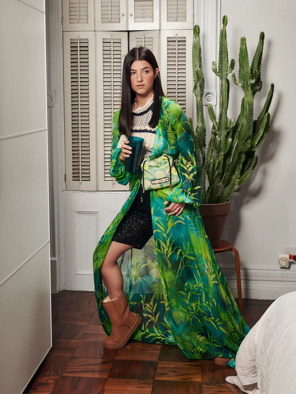 Charli wears dress by Versace, top by Eckhaus Latta, shorts by Norma Kamali, shoes by Ugg, bag by Kenzo