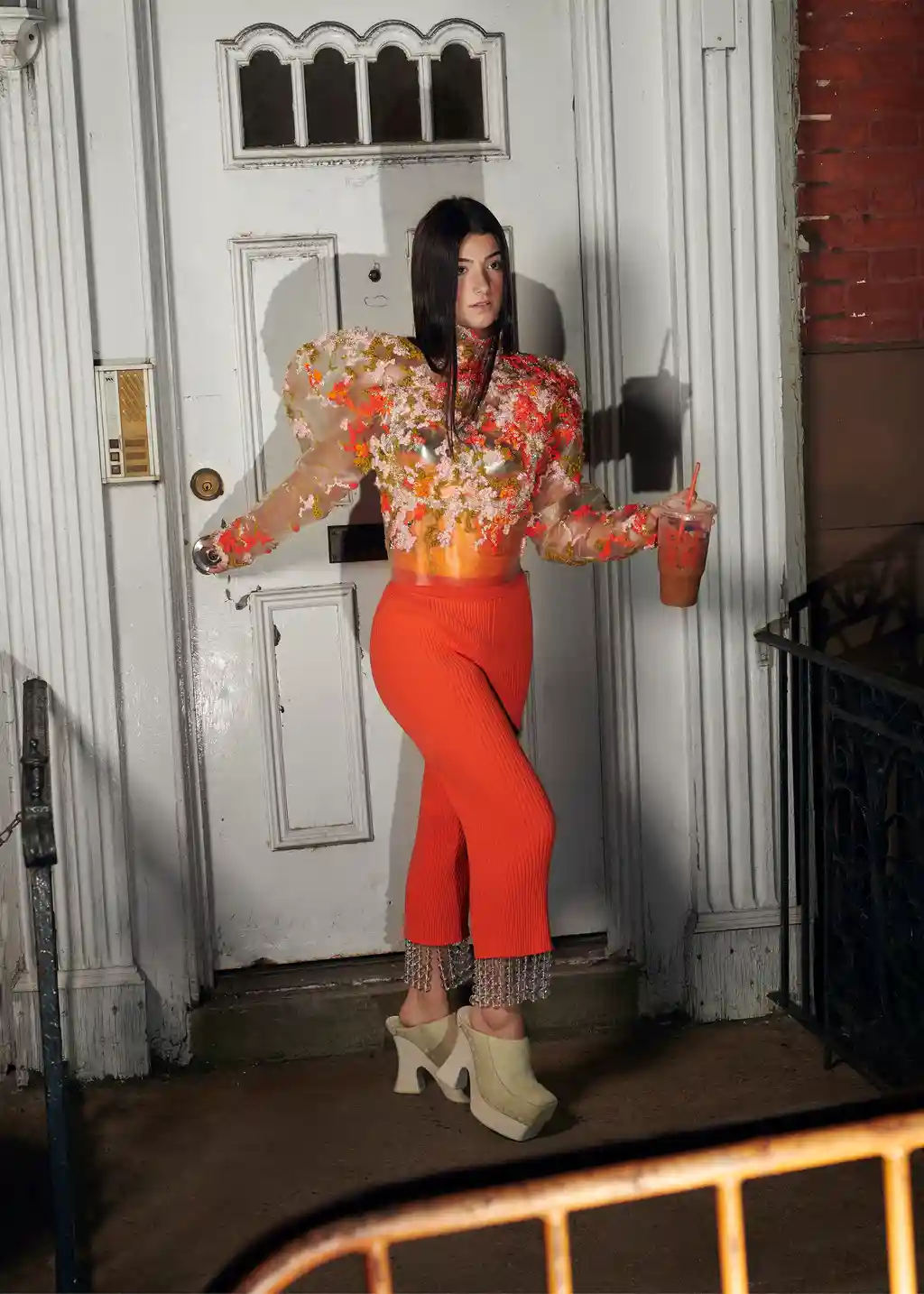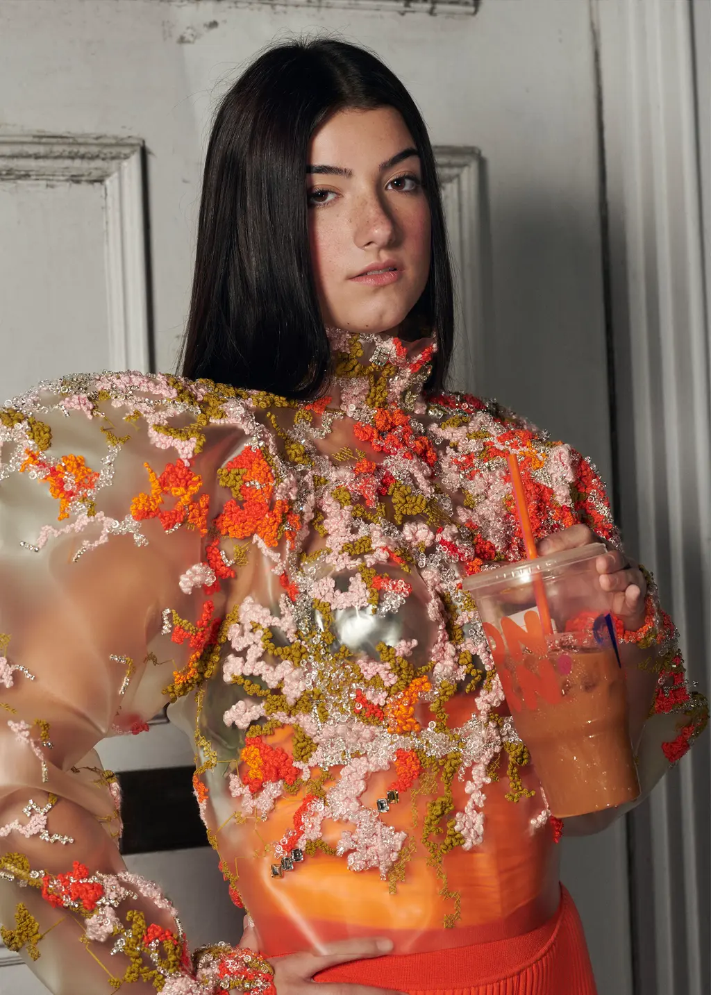 Charli wears bathing suit by GCDS, top by Zille Huma, pants by Opening Ceremony, shoes by Eckhaus Latta
