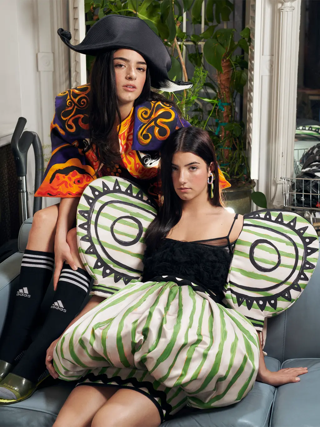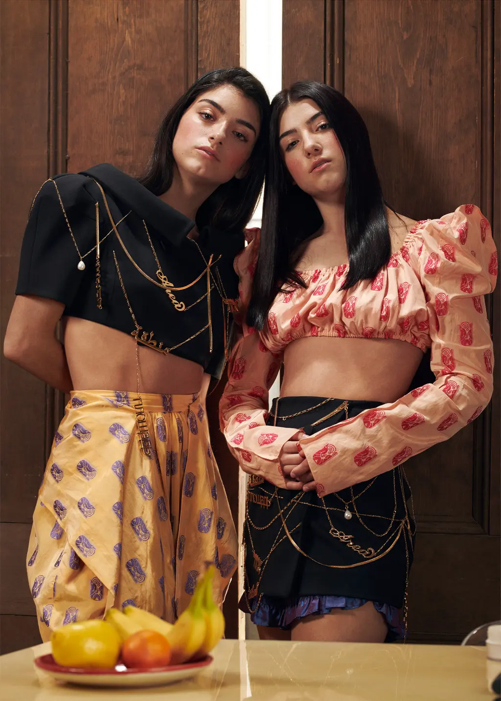 Dixie wears top, hat and jacket by Moschino, shoes by Melissa, socks by Adidas. Charli wears top and skirt by Moschino, top by Vera Wang, earrings by Beate Karlsson
