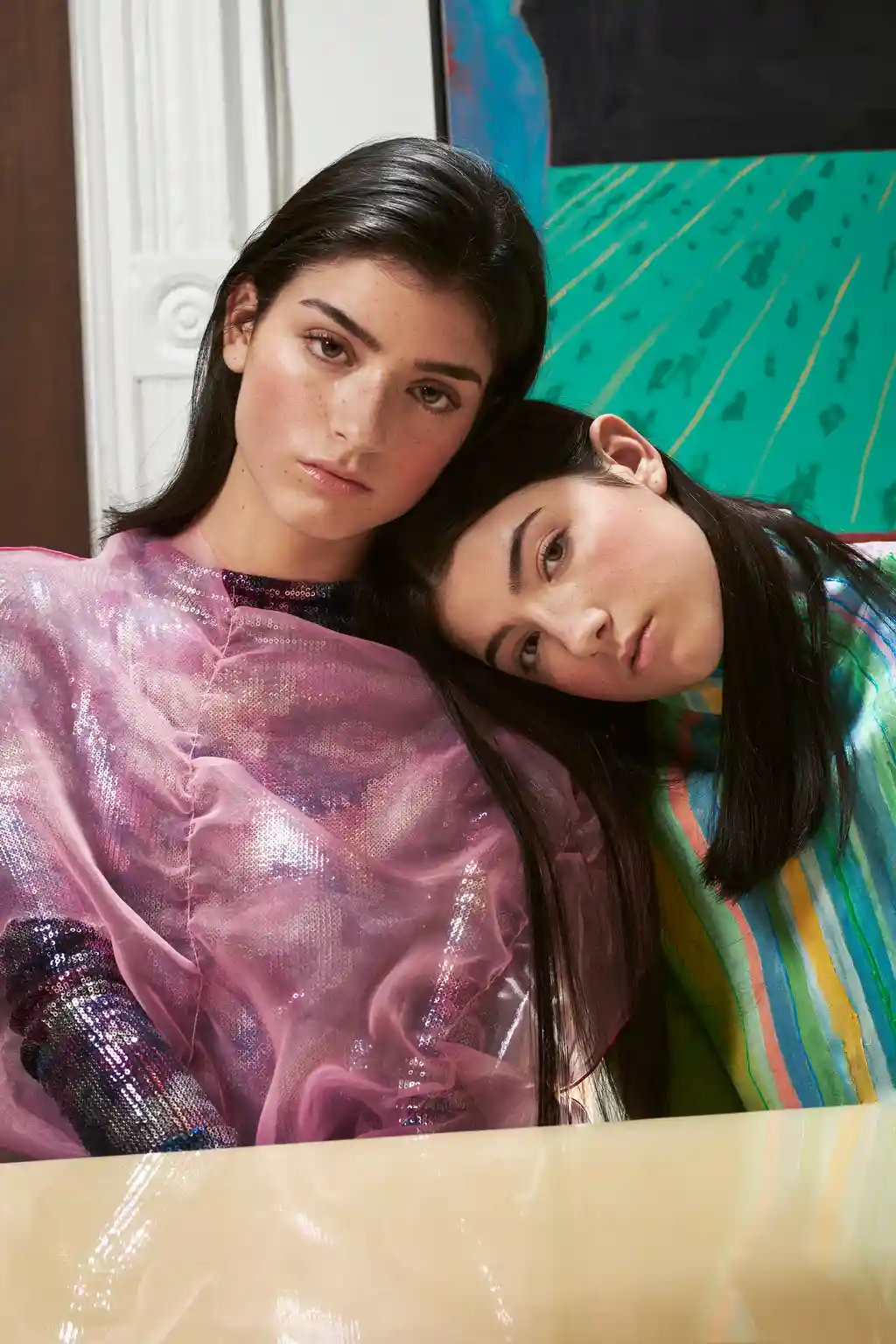 Dixie wears bodysuit by Collina Strada, dress by Beate Karlsson. Charli wears top by Beate Karlsson