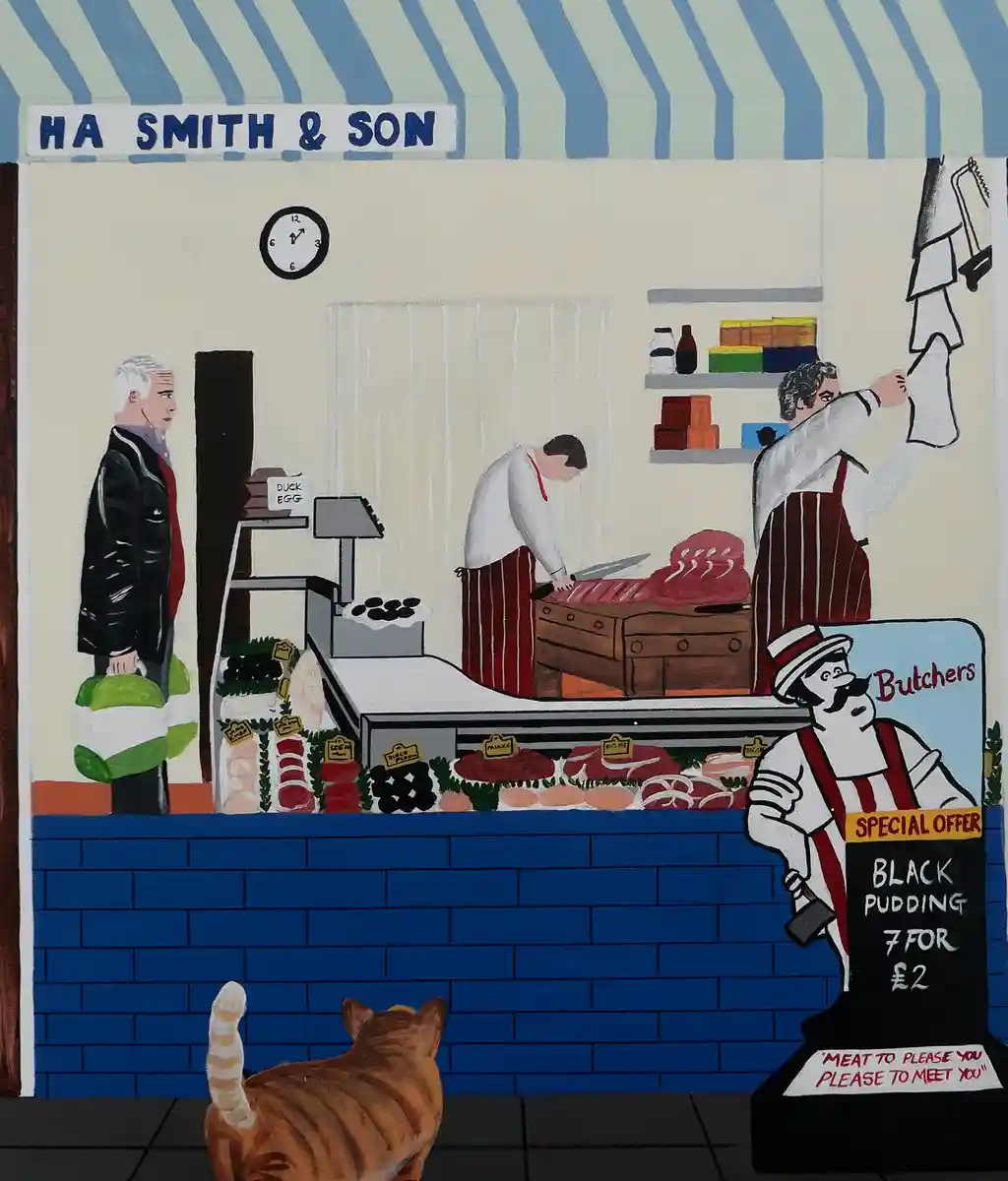 The scenes in the series were inspired by Murgatroyd’s conscious decision to shop from more independent stores in his local area a while ago: “For the price in big supermarkets, the quality of food doesn’t come close to all my local shops,” he says. It all started, though, with his love for Manze’s Pie & Mash on Peckham High Street – an established, much-loved eat-in, serving the community since 1902. For the artist, it was all about the old-school interiors and “great character”. “I just wanted to capture that,” he says. “Then it was a domino effect of me doing paintings of all my favourite shops.”