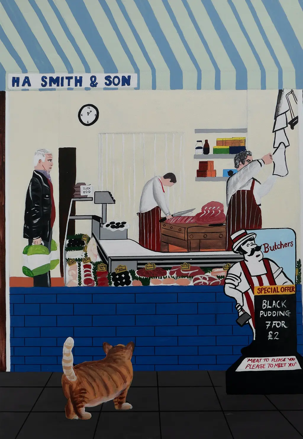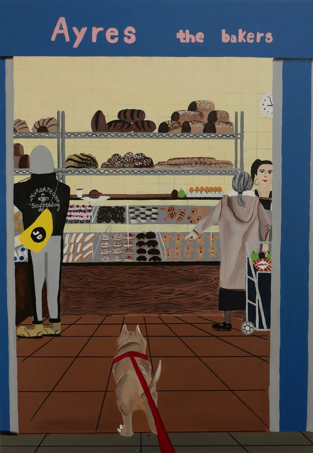 “The human interactions in the paintings are the reality that I see,” 25-year-old Murgatroyd says. “I love going to the shops and looking from a distance, watching everyone go about their daily lives.” Whether he’s painting chatty old locals, menacing scaffolding vans or, the artist’s favourite, Rottweilers, each scene catches a moment in real-time. The artist’s voyeuristic style is particularly playful in Yum, where he paints an “imaginary American bulldog” walking into the shop, while a teen carrying a JD Sports bag eyes up bread in a bakery.