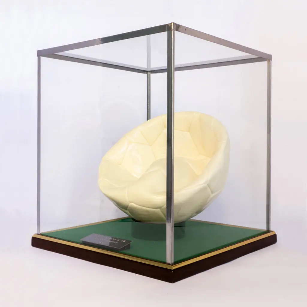 The experience of losing in this environment is something Shaw grapples with in Contender. After seeing old “runner up” trophies on display at home, he thought “I can make one that describes losing better than a man who’s got his arms up like he’s victorious.” And so, he’s created alternative trophies encased in protective glass boxes, like a weathered boxing glove curled up in the fetal position – an ode to his harrowing experience in the ring.