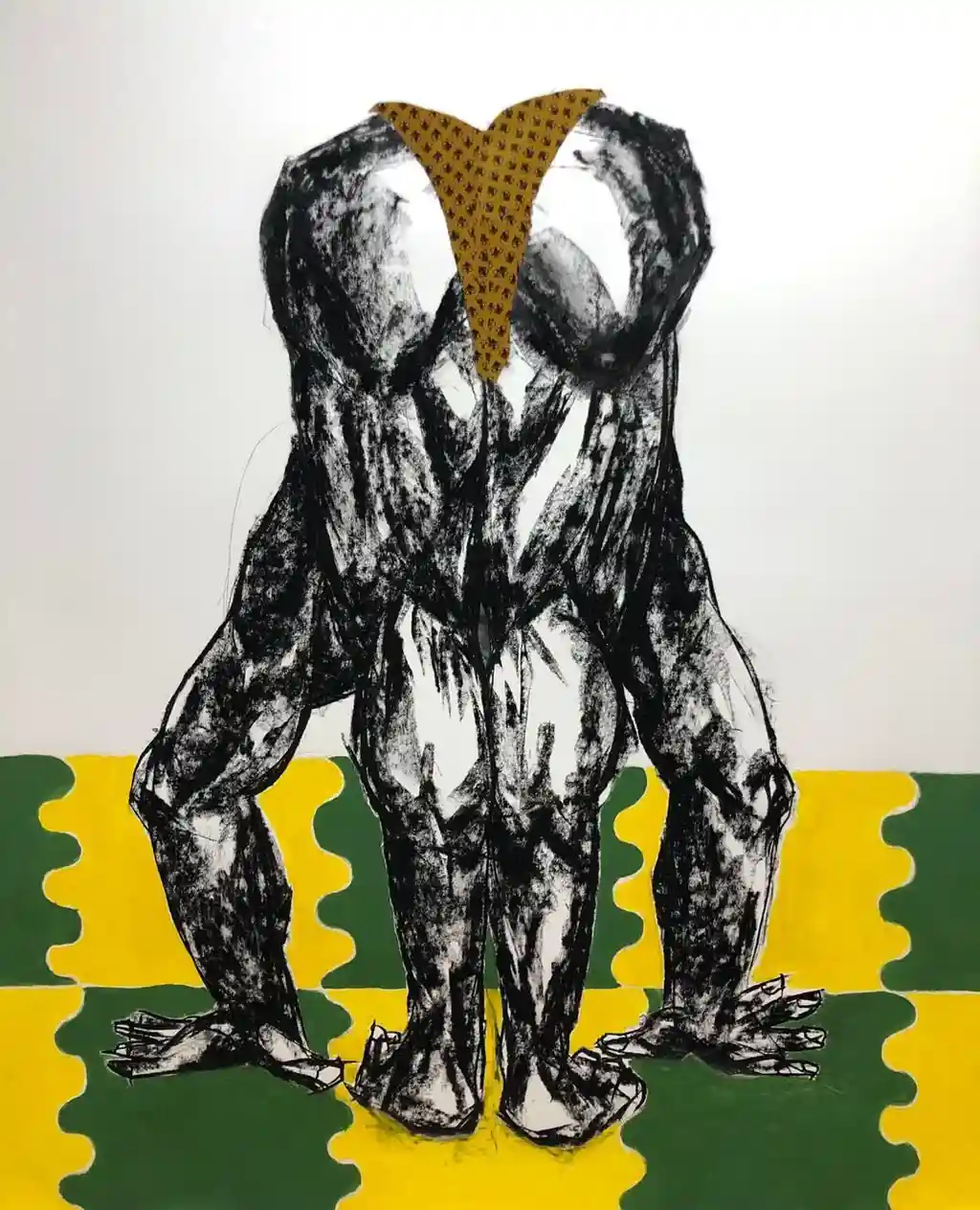 Jiménez’s mixed media collage titled The Contest – that depicts three toned body builders with cut-out faces flexing their muscles – nods to his father’s haunting words about white bodybuilders who massage their skin with self-tan lotion to accentuate their muscles: “Everyone wants to be a n***** when it’s a competition!”