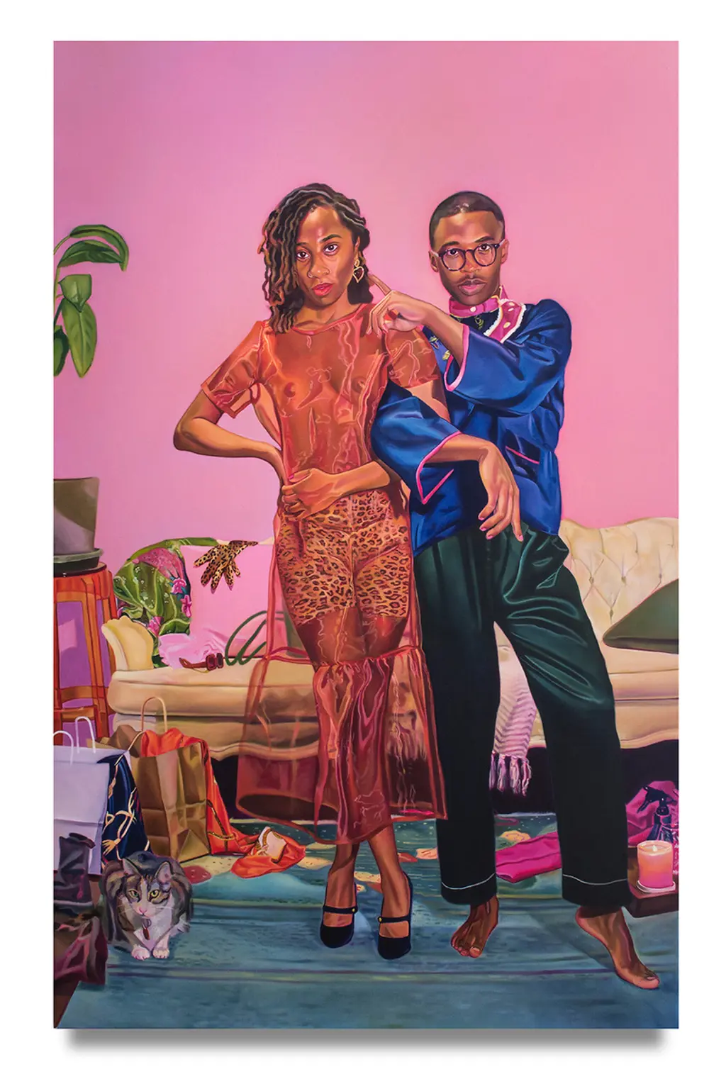 Jiménez isn’t the only artist using a paintbrush to investigate memory and methods of unlearning societal doctrines. Boyland – a young master of grasping his sitters amidst light-filled, elegantly cluttered bedrooms – is too: “Growing up, I digested reruns of the Brady Bunch, Good Times, Full House, and images in magazines. I am interested in colour and light as they are experienced and seen in space and objects, but also through the body [to convey] fear, anxieties, joy and pleasure with colour.”
