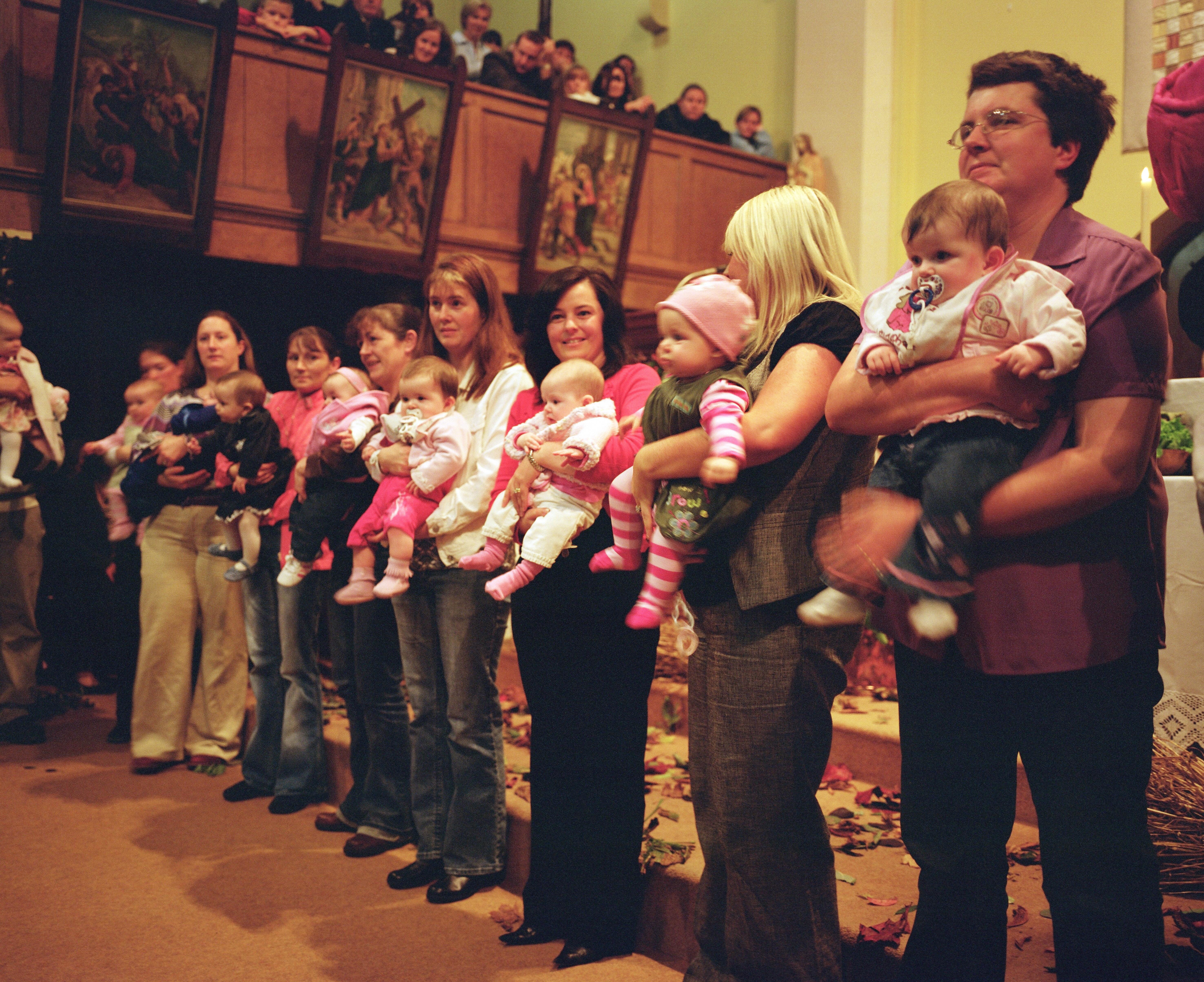 Joel and Lucy are especially proud of one spread. On page 186, an image of a group of Ulster Defence Association members in insignia’d jackets and sunglasses is positioned next to a photo of women in church, all holding babies dressed sweetly in pink, in line to be christened. The images look eerily similar, both groups standing in the same formation.