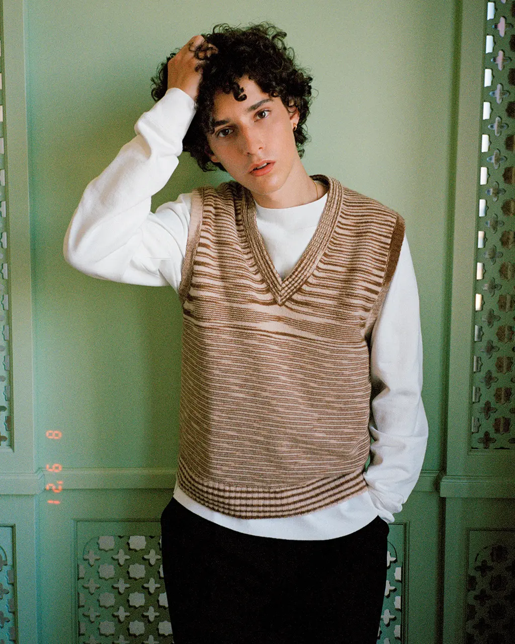 Filippo wears vest MISSONI, jumper MARGARET HOWELL and trousers MSGM