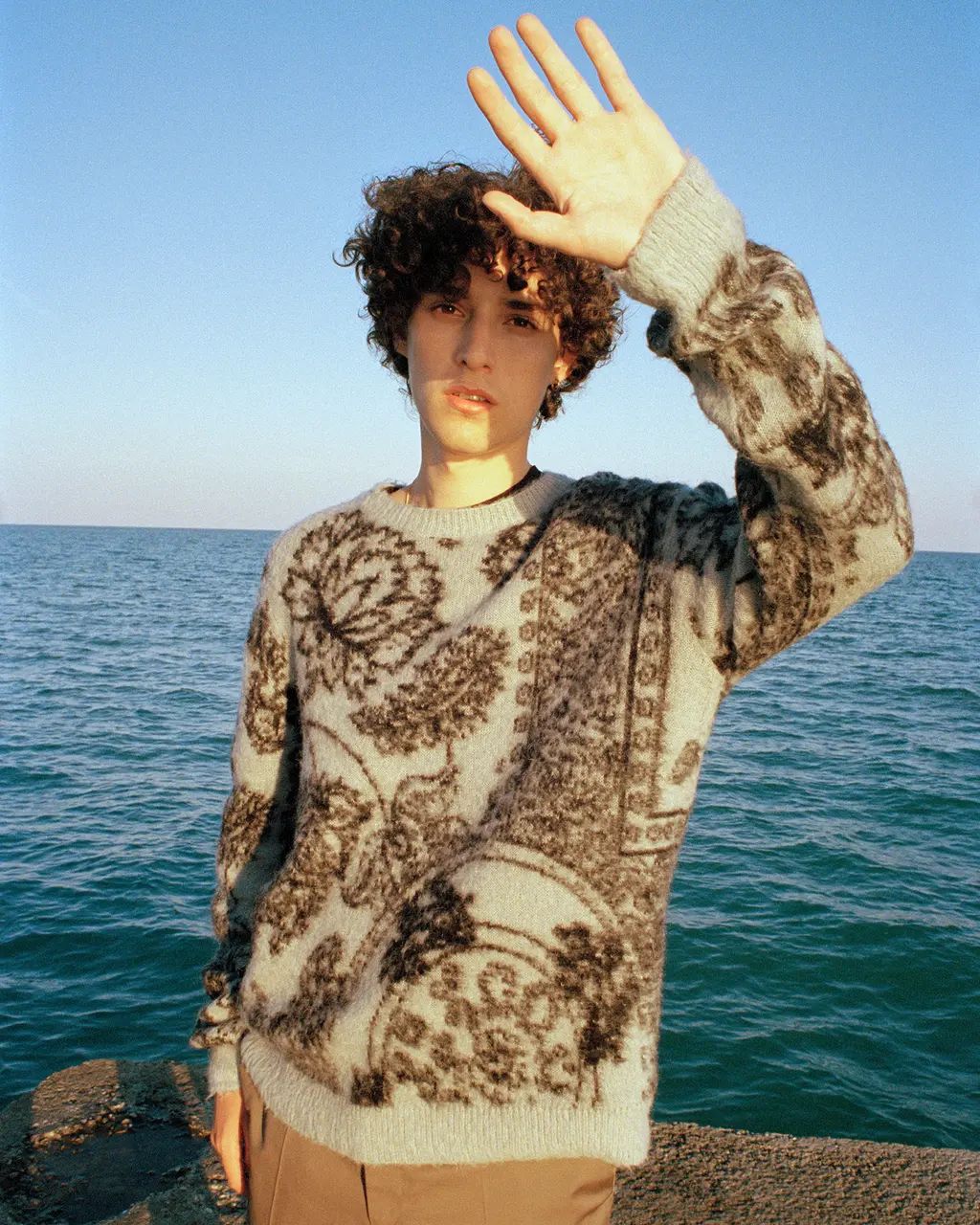 Filippo wears jumper MSGM, T‑shirt Margaret Howell and trousers SUNFLOWER