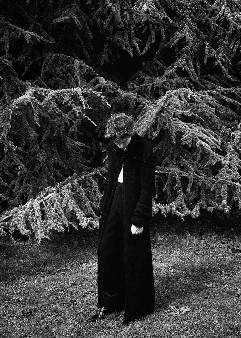 Fionn wears cardigan, trousers and shoes SAINT LAURENT BY ANTHONY VACCARELLO