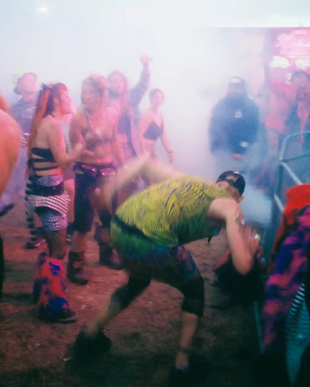 My need to capture this came out of frustration during lockdown. I didn’t have many pictures that really took me back to those brief periods of time. At a gig, it makes total sense to point our phones at the performers, but the magic of these events comes from the intimate moments in between. I could see a lot of this in pictures of Woodstock, or Seana Gavin’s images of free parties in the ’90s. Those were the starting points for this work. Their saturated, hazy aesthetic felt like someone was replaying my memories.