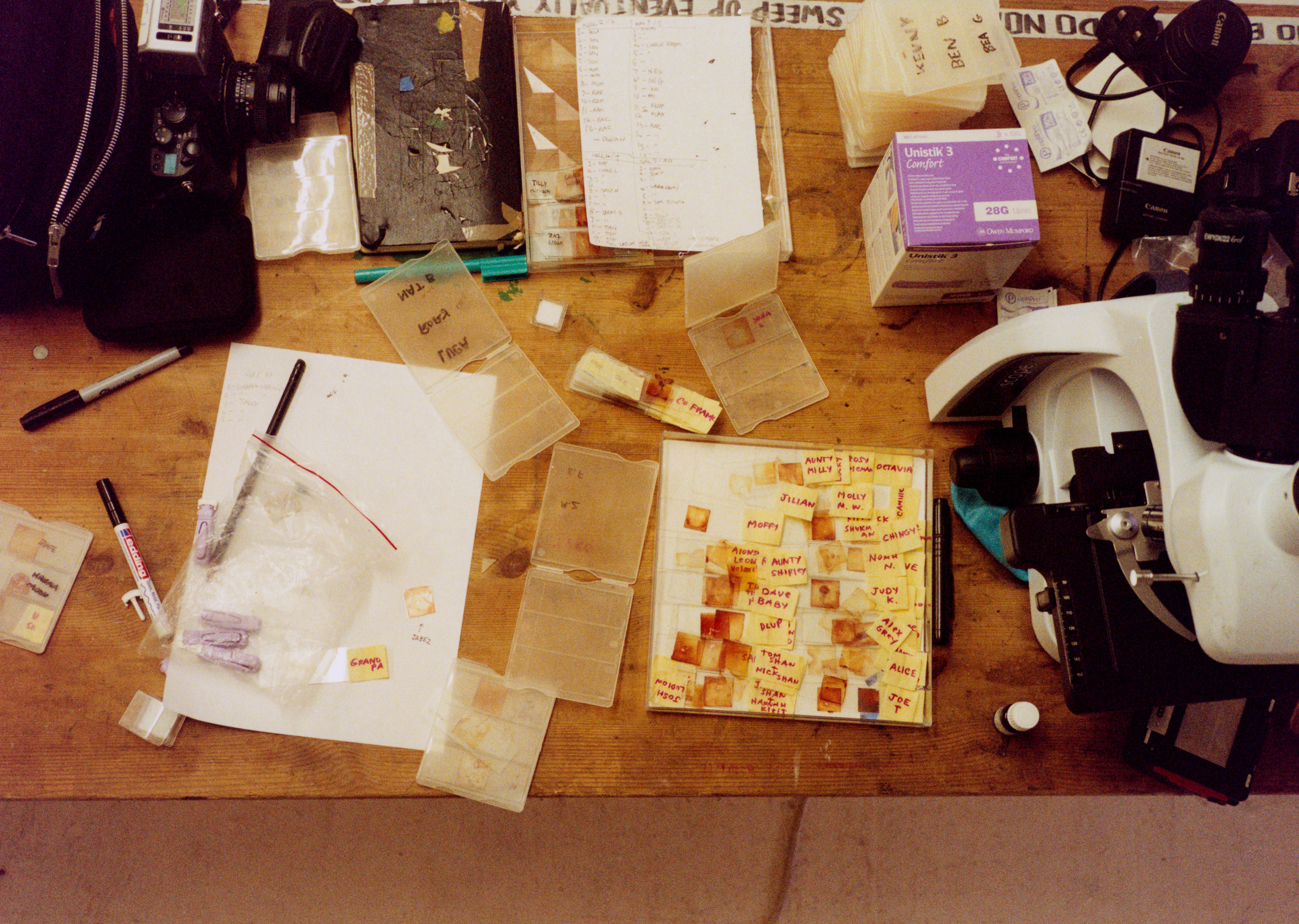 Between these abstract flashes of light, you’ll find shots of loved ones sleeping, faces half-obscured and haphazard family trees drawn onto images, as Frank attempts to bridge that strange gap between biology and real life. In an accompanying essay, artist Laura Serejo Genes draws parallels between Frank’s work and the French surrealist photographer Jacques-André Boiffard, who was also a medical student and, in 1951, contributed images of blood for publication as part of scientific studies. How’s that for full circle?