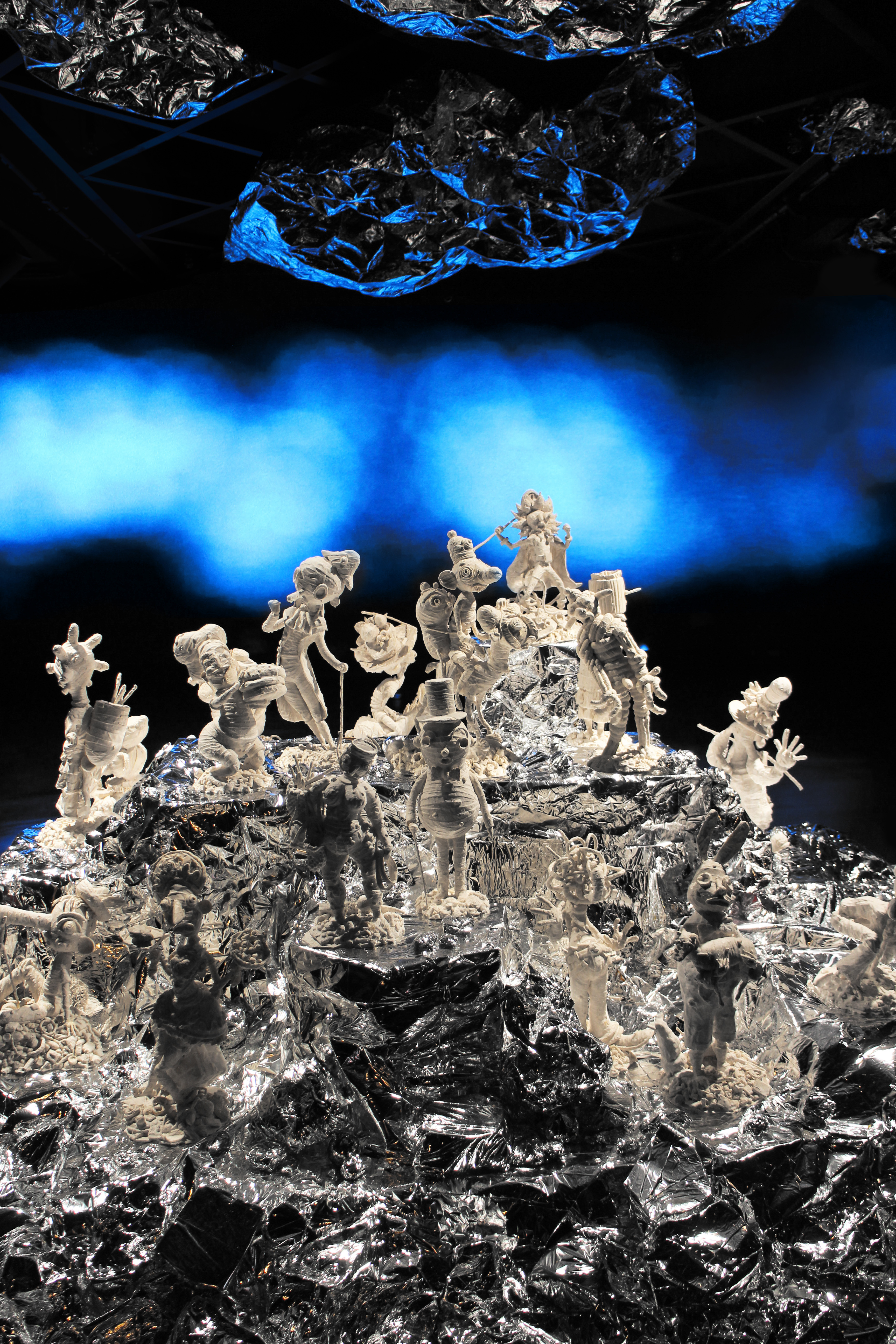 Then, there was the physical set, which is very much about me and Jason putting things together. Then, it was basically me in the studio or in the kitchen of my house, building little things, watching TV, making tiny stones out of foil, classic Gary stuff – the kind of thing that I’ve been doing for years. That’s the other funny thing: animation is brand new but the set build is very, very classic, quite Tetsuo: The Iron Man, an old Japanese horror movie that I used to love when I was a kid. The foil idea was because we wanted the screens to reflect off the set. So when everything’s red, the set becomes red, and when there’s a blue moment, the whole room becomes blue. You know, one of my favorite things to do is find a really simple material and do as much with that material as you possibly can. For this, we were spray mounting onto colorama and then scrunching it to make clouds. It’s silver, it’s frosty; it feels very winter wonderland vibes.