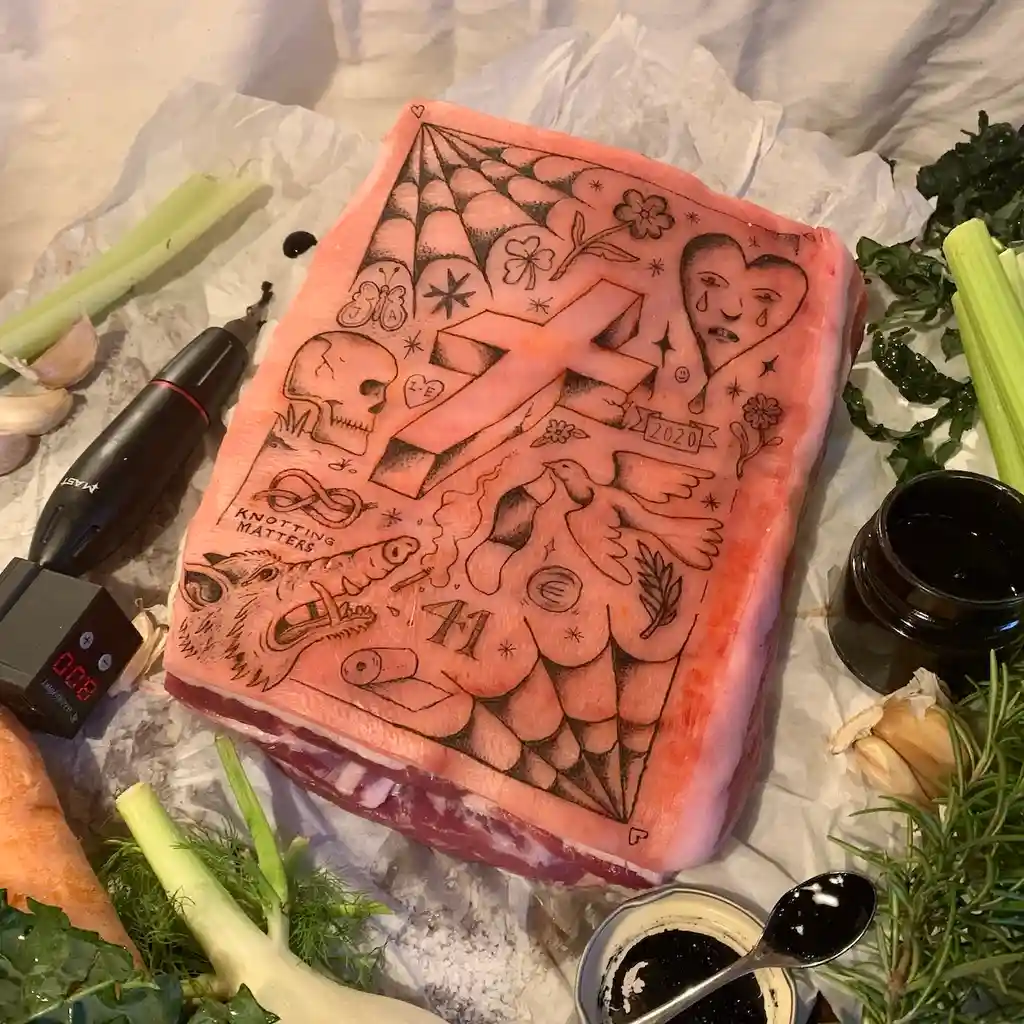 And this experimentation isn’t confined to desserts – he’s having fun with main course food as well. “Over Christmas I was tattooing pork bellies with squid ink for my family’s New Year’s meal. I like pushing the envelope of what’s possible and OK to do with food, walking that fine line,” McCallum says. He mentions one of the first cakes he made: a giant cigarette birthday cake with a smoke machine in it, followed by a kebab cake for his friend “who loves a doner. Birthday cakes are so personal and can often end up defining the day.”