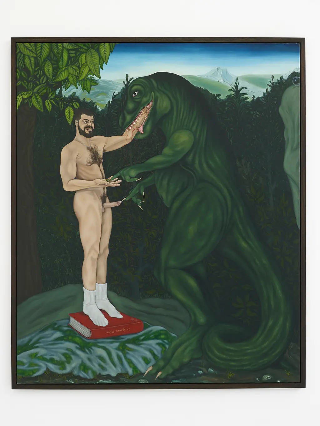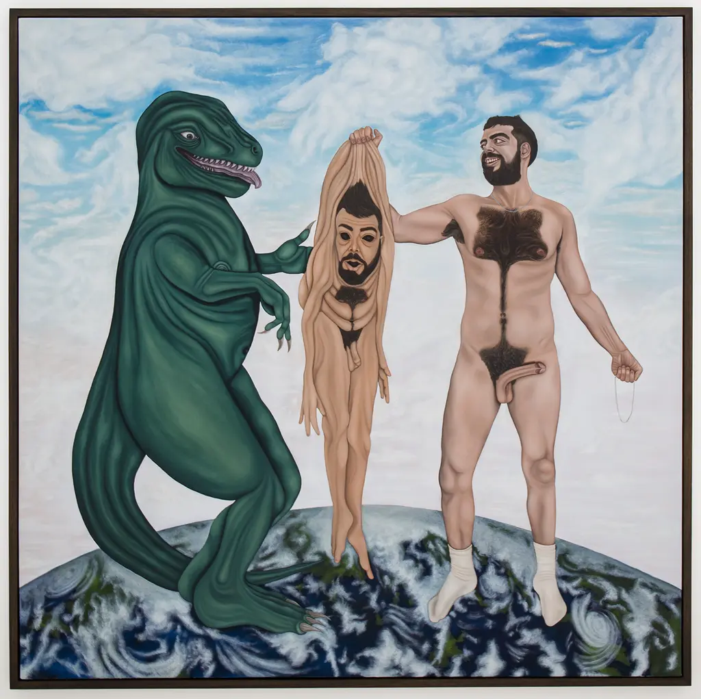 In one of his latest works, a witty self-portrait titled Born, there’s nudity, and a lot of it. His cheek is on full display, as are other body parts. Pudvine stands there, smiling, naked and erect, wearing only socks, while a dinosaur chomps on his forearm.