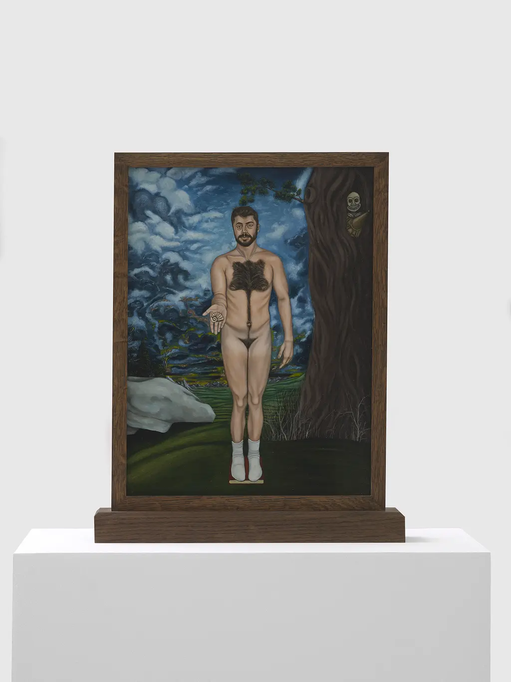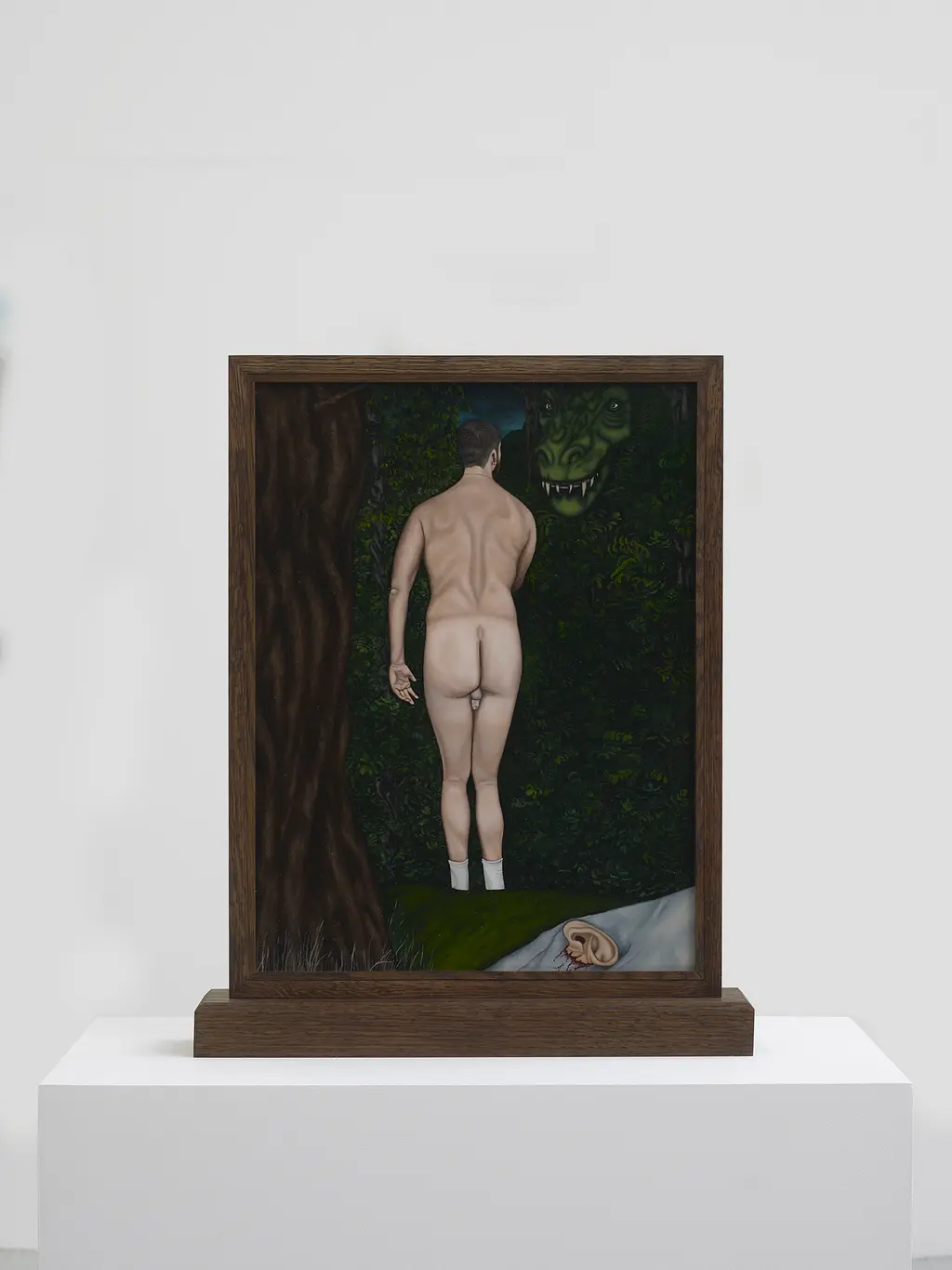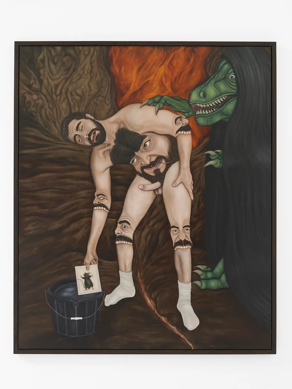 Dawn, from 2019, shows the artist in a hellish fiery landscape, his penis blown up to enormous proportions, big enough to take your eye out. Also pictured: a bird humping a limp rat and, of course, hosiery.