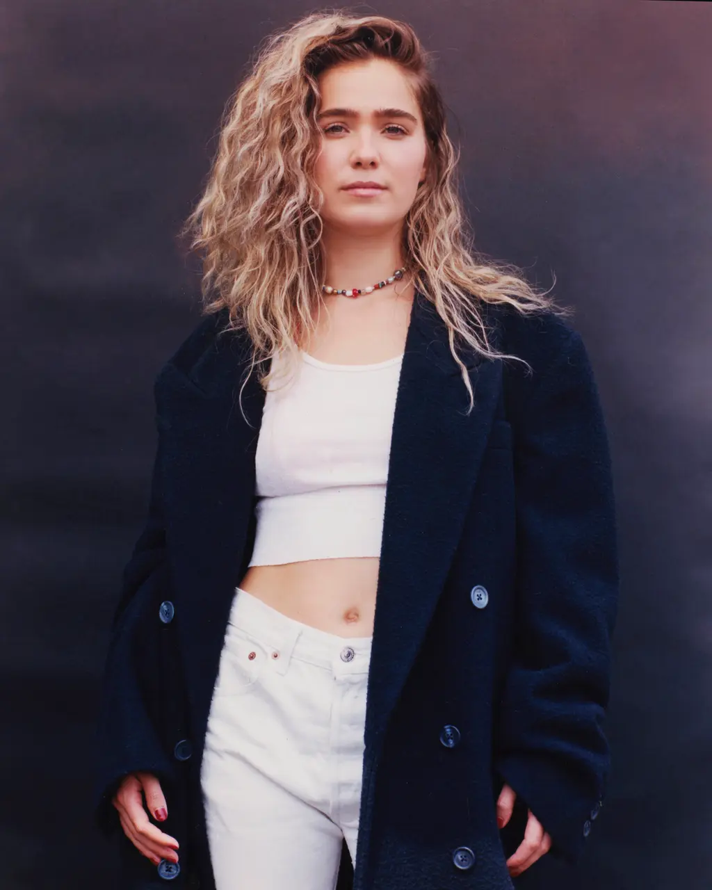 Haley wears coat Fendi, necklace Karo Karu, tank top Hanes, bikini top (worn underneath) Palace Costume, jeans Levi’s