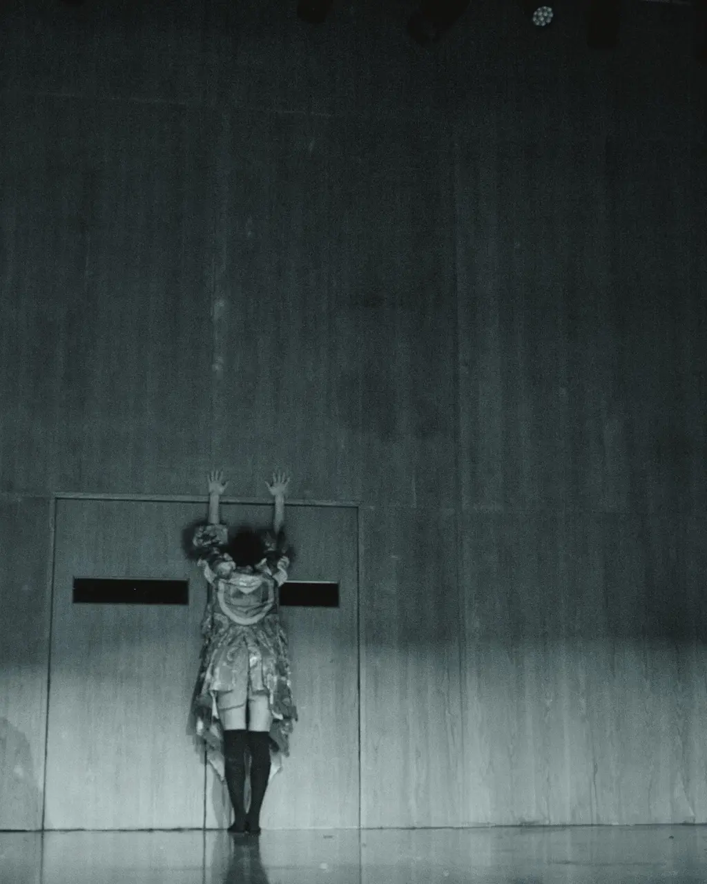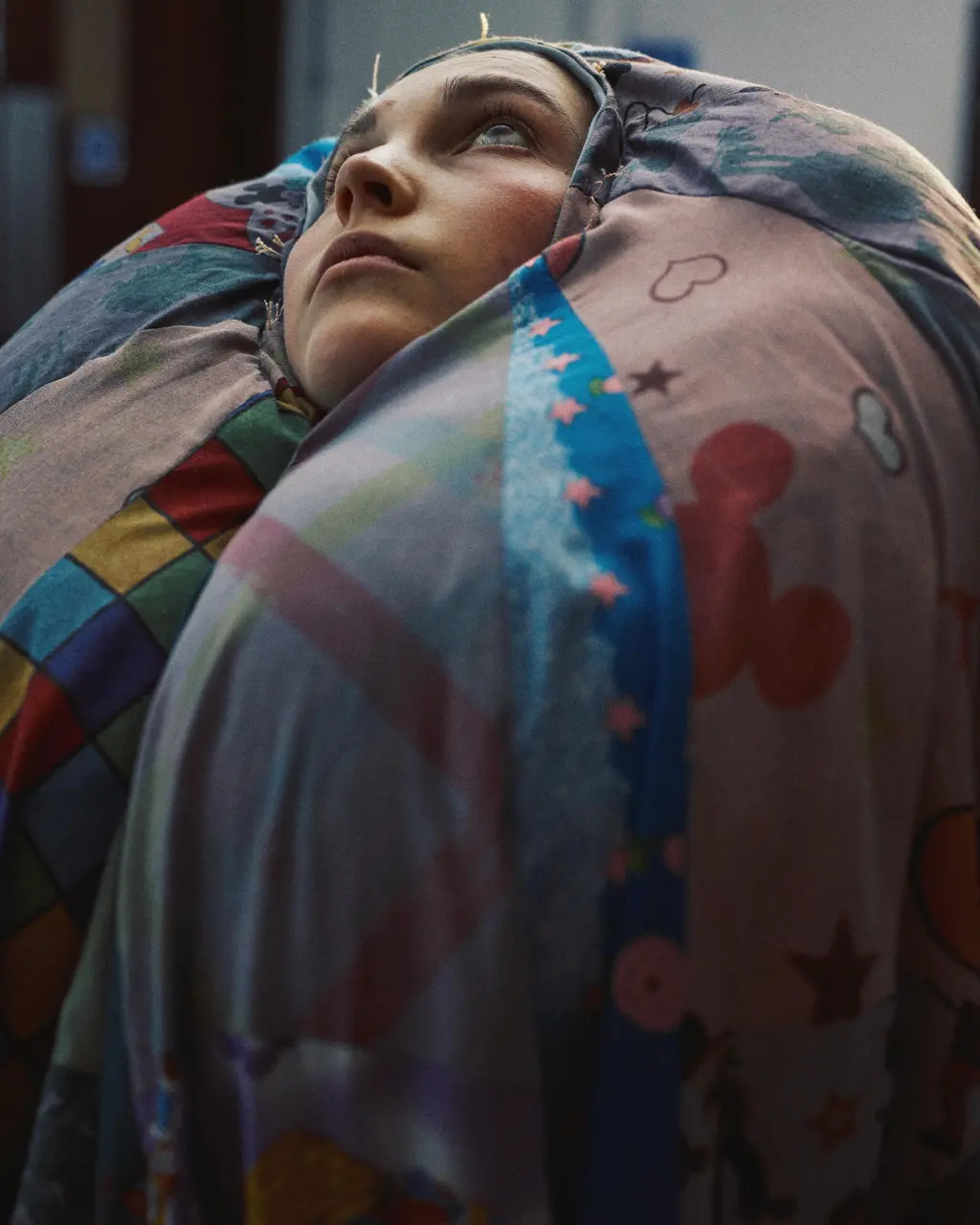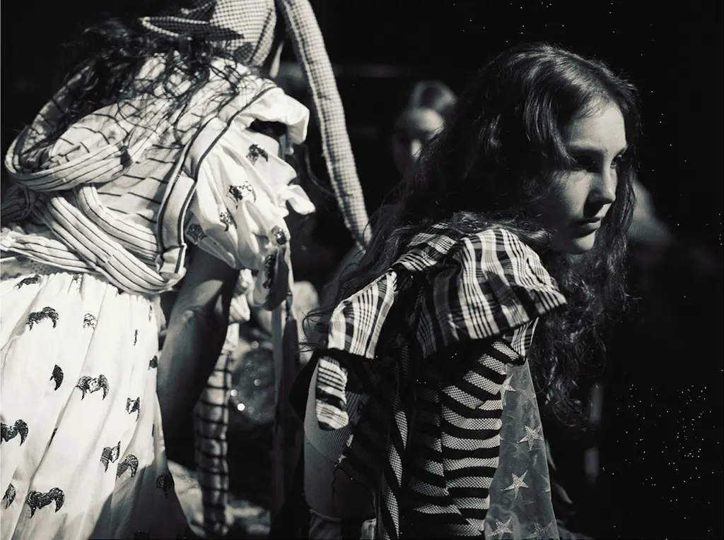 This month, Blakey is unleashing some more thought-provoking stuff on the world. A Wound With Teeth recounts an emotive story through the use of eerie nursery rhymes, high-octane outfits and folk tales. Backstage, things get cramped as dancers lounge on a sofa, while others flit in and out of the brightly-lit toilets to eye up their costumes. Cast member Violet awaits her cue in a patchwork dress made from vintage kids’ blankets shielding her entire body, her face peaking through the costume.