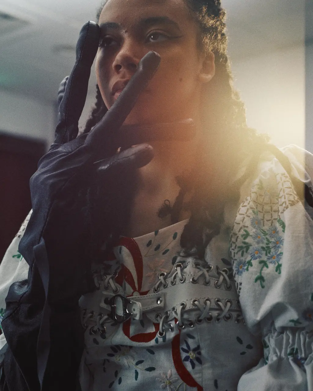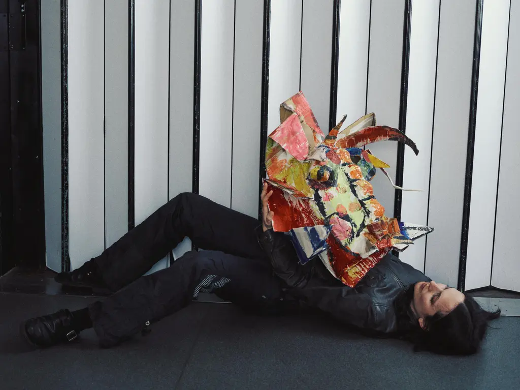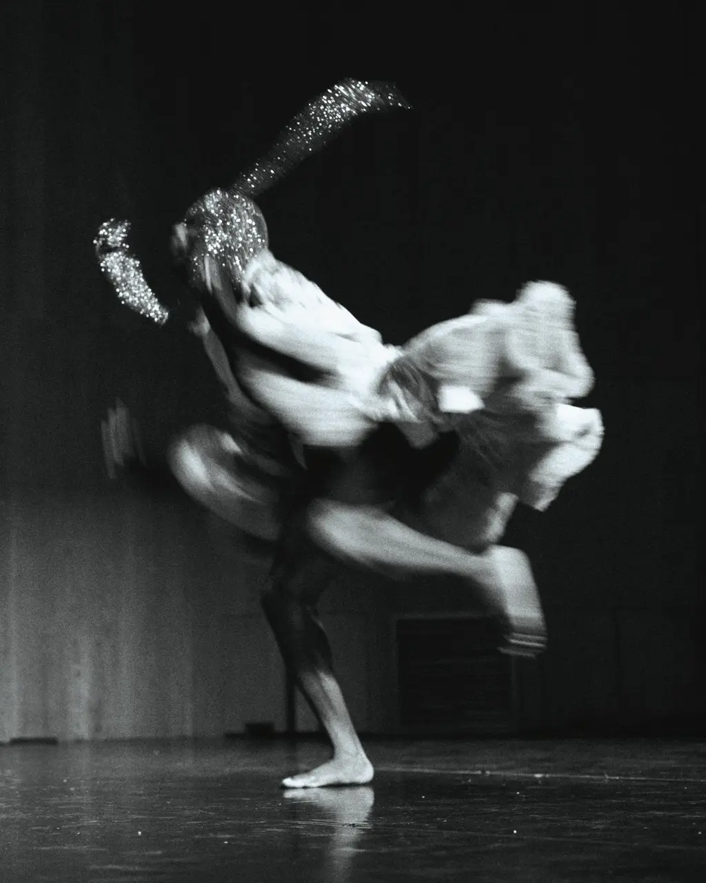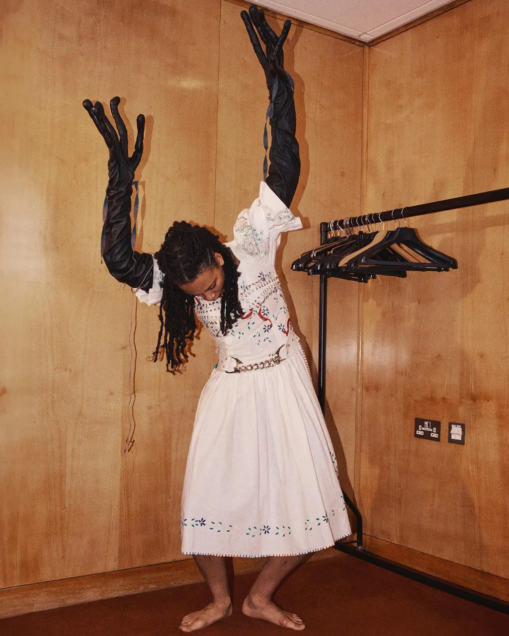 In the corner, another dancer, Elizabeth, puts on a pair of freakishly long black gloves with bulbous fingertips, a present by Welsh designer Paolo Carzana to the head of costume, Matthew Josephs – the stylist and creative director known for steering much of FKA twigs’ creative and working with photographers including Harley Weir and Alasdair McLellan. On a table lie two comically large paper mache heads: a horse and a dragon, both with eyes made out of spoons and plastic jagged teeth. Not your average dance props, eh?