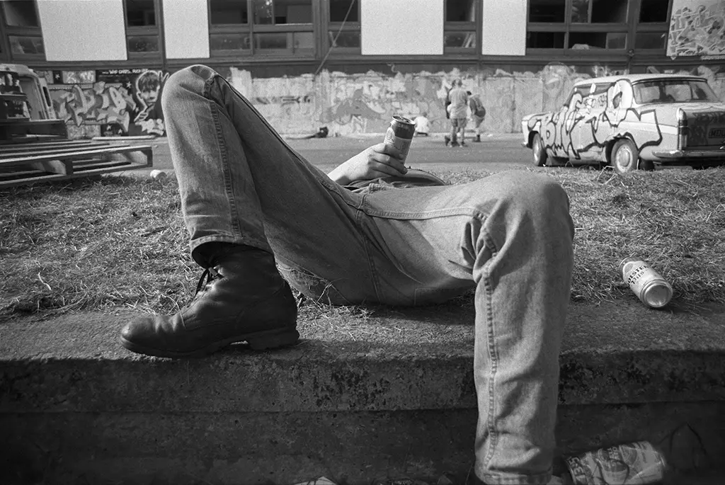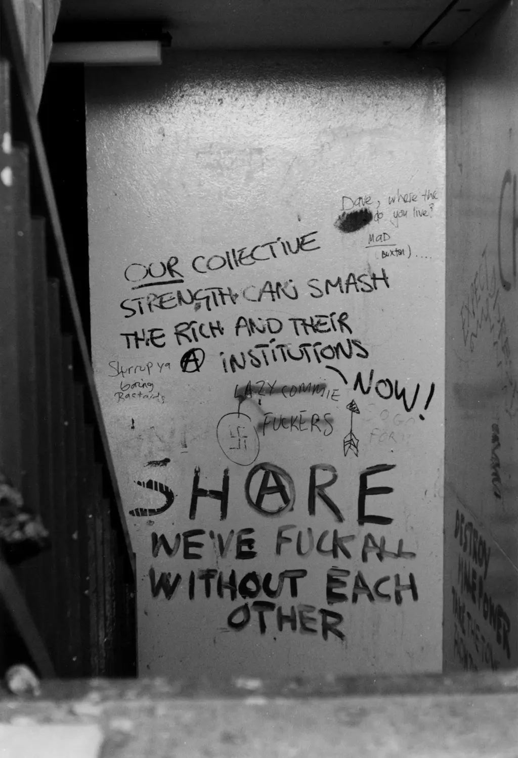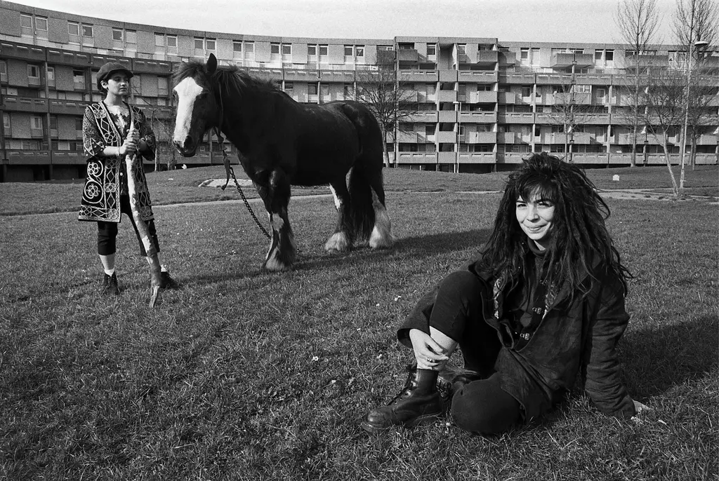 The likes of Davis followed in the late ’80s, when most of the original residents had left the badly built, poorly maintained buildings which suffered from asbestos, prolific damp and mould, as well as cockroach and rodent infestations. The council stopped collecting rent in 1984 and police avoided the area. At the time a bright-eyed student, Davis was one of a few photographers to chronicle the late ’80s squat scene whilst squatting in the Crescents himself. He describes his time there as like “getting on a runaway train.”
