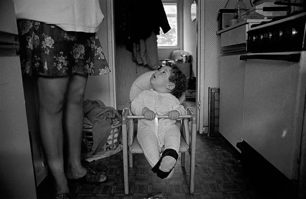 Often in Hulme, it’s the walls and architecture that pull photographers in. “She was drawn initially to peeling paintwork or the graffiti,” says Nan Levy, Baker’s daughter. “She would zone in on that and then somebody would walk past. Inevitably the pictures with the people in them would end up being the best.”