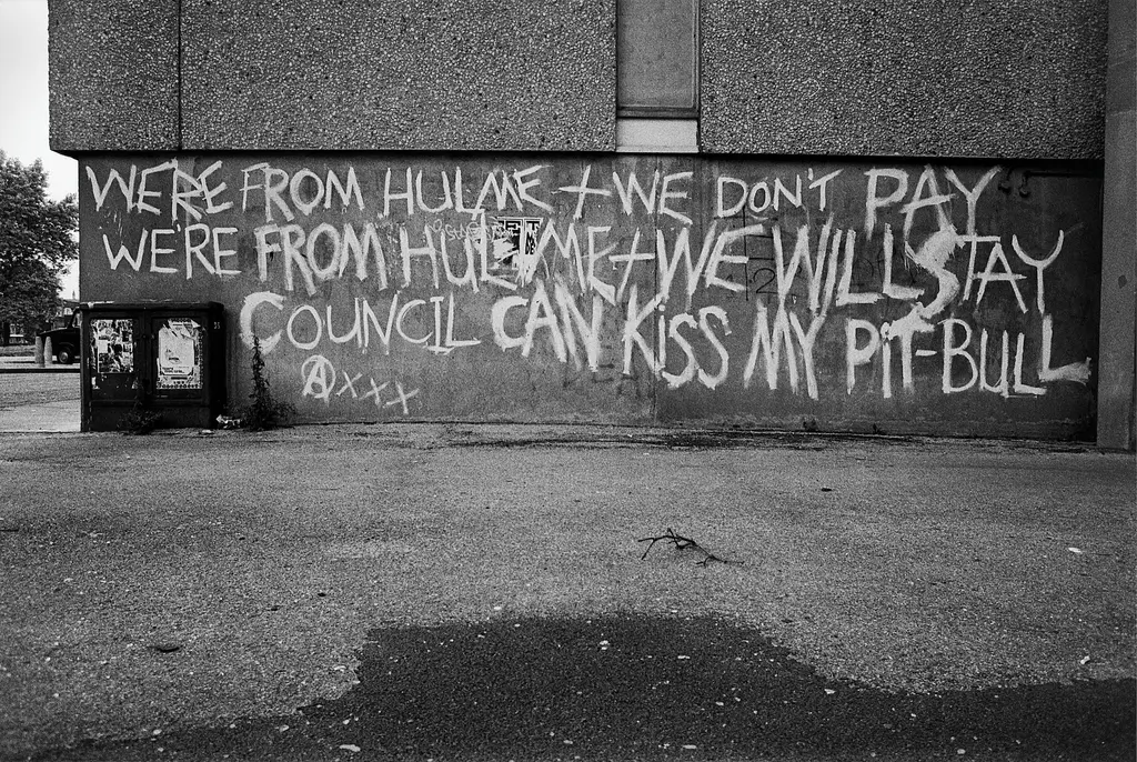After heavy bombing during World War II, much of the area’s terraced housing was condemned for slum clearance in the ’60s, being replaced by the Hulme Crescents housing development in the ’70s, which was itself demolished by 1995. Today, Hulme is a mixture of residential and student housing, as the Homes For Change social housing development and cooperative continues to channel the area’s passionate community spirit.