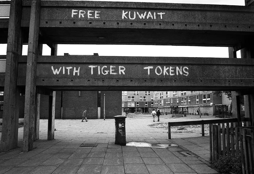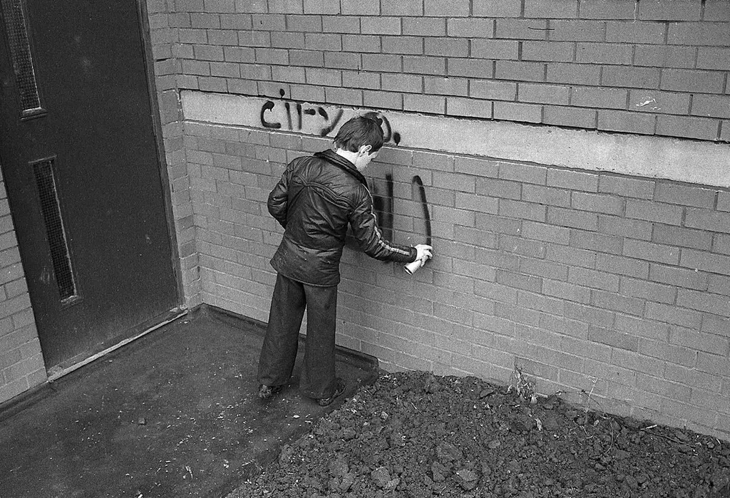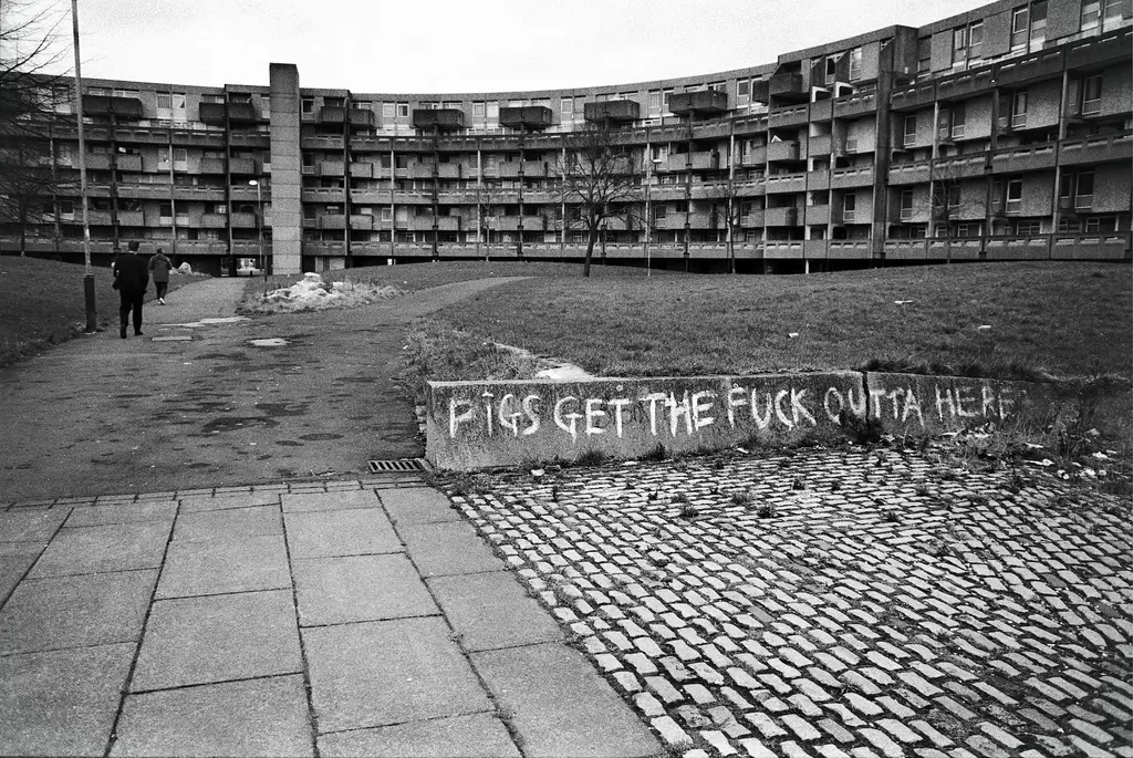 The area was a creative melting pot. An anti-establishment, fiercely independent and culturally diverse community were living in a notoriously dangerous space that had been left to bubble away. Davis shot as much of it as he could. The bands of Factory Records and the Haçienda, and the soon-to-be legends of the North West comedy scene – Steve Coogan, the late, great Caroline Aherne and Henry Normal – all passed through the DIY studio in his flat in the Crescents. In the morning, the best time to avoid being mugged, he would capture the graffiti, the politically-charged atmosphere and the people that were left behind, occupying the streets in the sky.