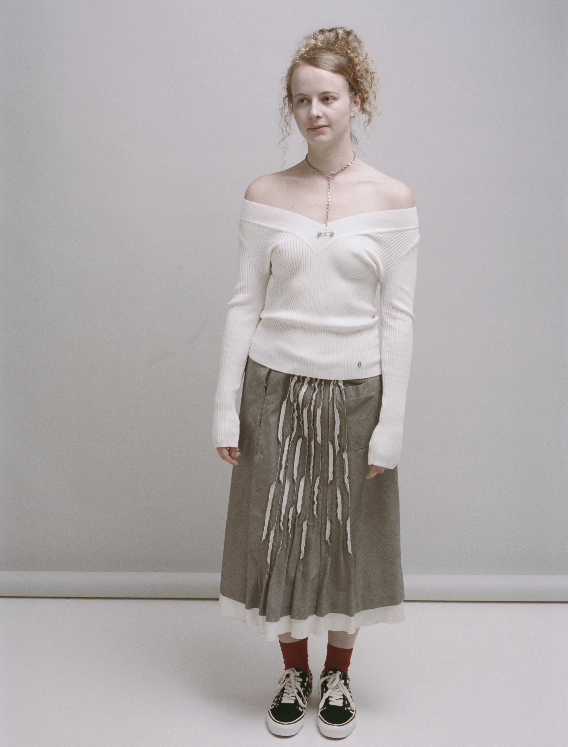 Sophie wears top GUESS, skirt, socks, earrings and necklace talent’s own and shoes VANS