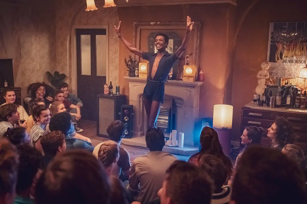In the show, Ritchie is joined by a handful of lads whose stories weave intricately, importantly, around his own. Roscoe, played by the effervescent rising star Omari Douglas, is a queer boy from the city who escapes his family’s Christian faith to live his true life in the Pink Palace. Wildly talented Welsh newcomer Callum Scott Howells plays Collin: a slightly gawky, perpetually suited Savile Row apprentice who feels like the group’s innocent baby brother. Then there’s Ash, a regular bed buddy of Ritchie’s whom actor Nathaniel Curtis, making his professional debut, describes as “calm, kind, but also very emotionally guarded”. He’s the wise, clear-headed one of this found family.