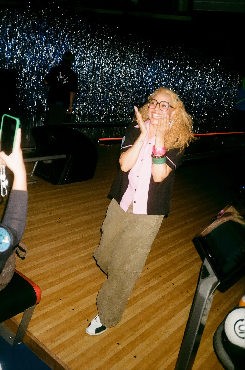 When I ask if awkwardness is cool now, Marquis pauses, then points to Audrey Hobert, a rising pop musician whose debut album Who’s the Clown? (2025) is the epitome of “to be cringe is to be free.” Coincidentally, one of the tracks, titled Bowling Alley, sees Audrey drag herself to a party she nearly skips, at a venue much like this one – she ends up hitting a strike.