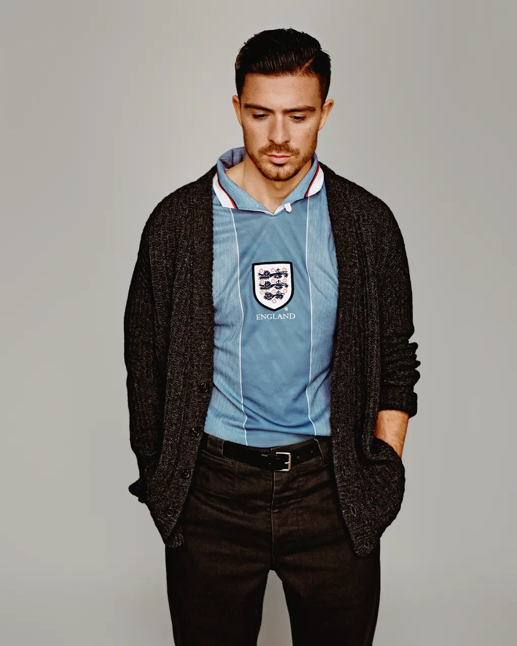 Soon after, he strips out of the short-shorts and into a smart, buttoned-up white shirt and black cardigan. From the other side of the studio, someone shouts, “You look like you’re in sixth form!” There is an undeniable boyish charm to Grealish. He’s outgoing and often cracks up at jokes that aren’t really funny, yet he’s also a bit shy, not one to shout the loudest in the room. He’s that lad in school who was in the rowdy, popular group, but was also the first to help anyone getting bullied.