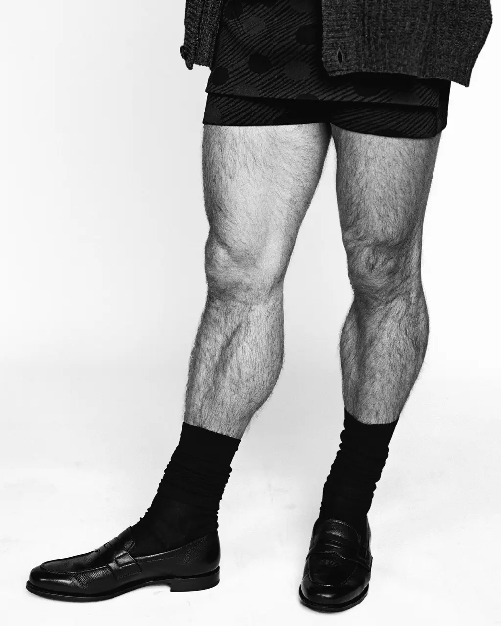 He’s given the choice of a slightly longer pair, but, just as he likes to do on the pitch, he opts for the saucier leg reveal. He’s a bit unsure at first, checking out his toned pins in the mirror before asking his agent what he thinks. The agent, ever vigilant and protective, is a little hesitant.